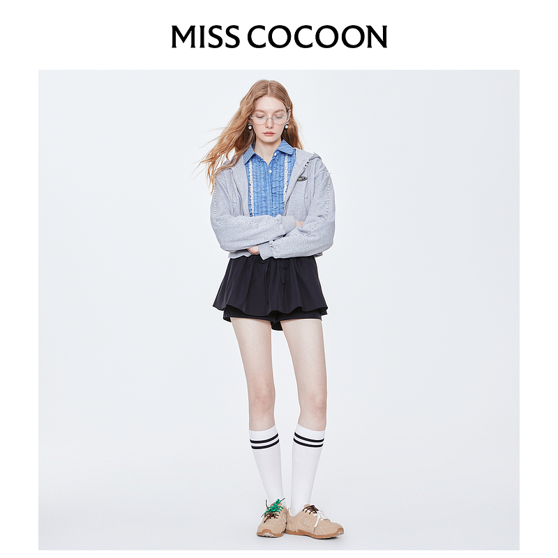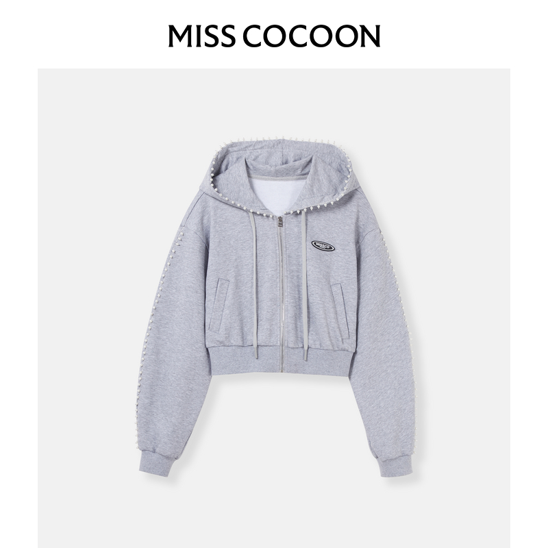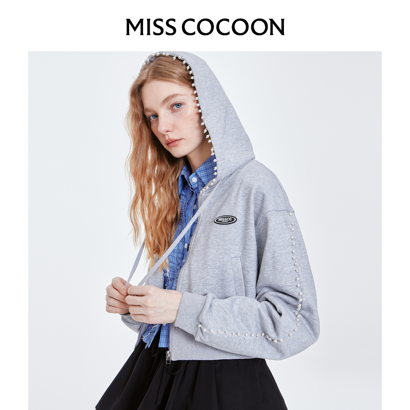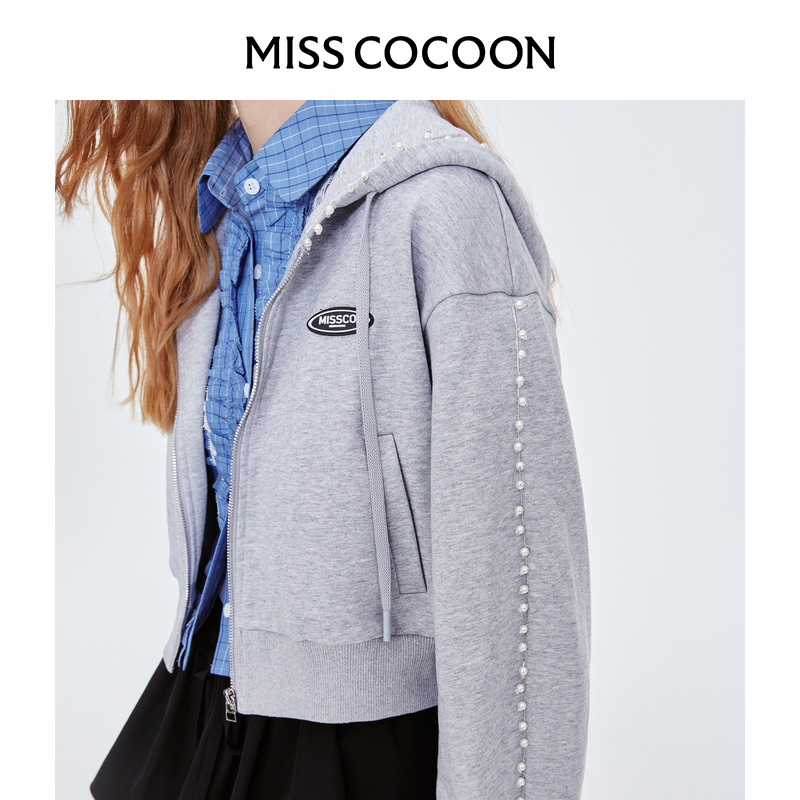missCOCOON经典珍珠夹边印花logo2023秋新女通勤短款连帽开衫卫衣