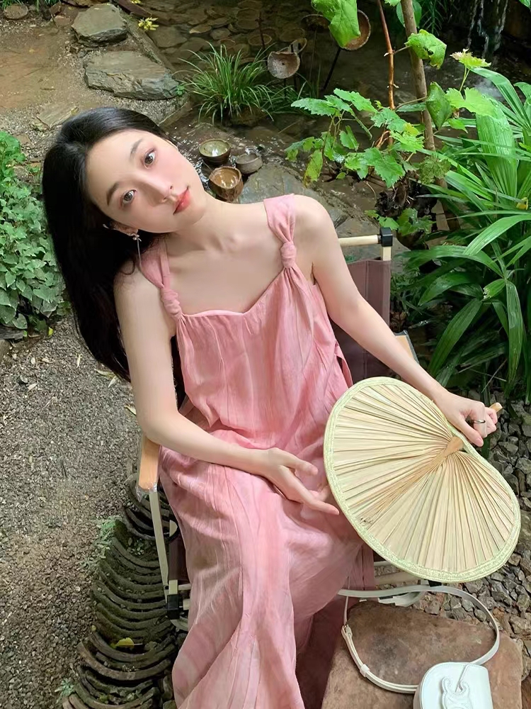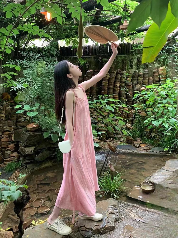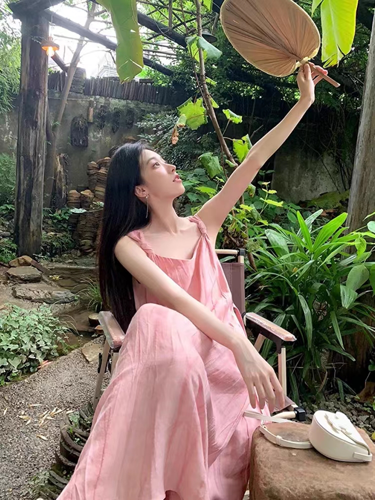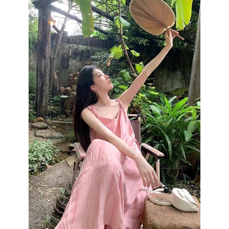 气质温柔风连衣裙女2025春夏新款高级感海边度假粉色晕染吊带长裙
