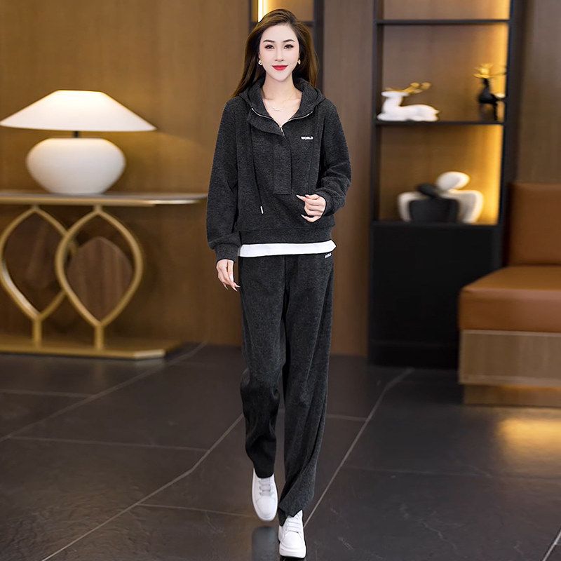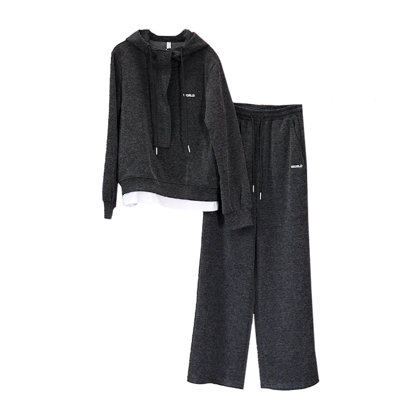 大码女装简约假两件连帽上衣阔腿裤两件套女2025秋季新款时尚套装