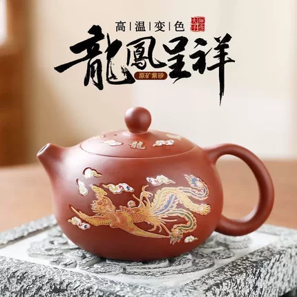 原矿紫砂遇水变色朱泥西施凤鸣壶半手工高档描金功夫茶具家用茶壶