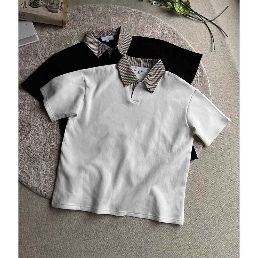 千鸟格拼接翻领正肩短袖POLO衫男款夏季潮牌半袖上衣男士有领T恤