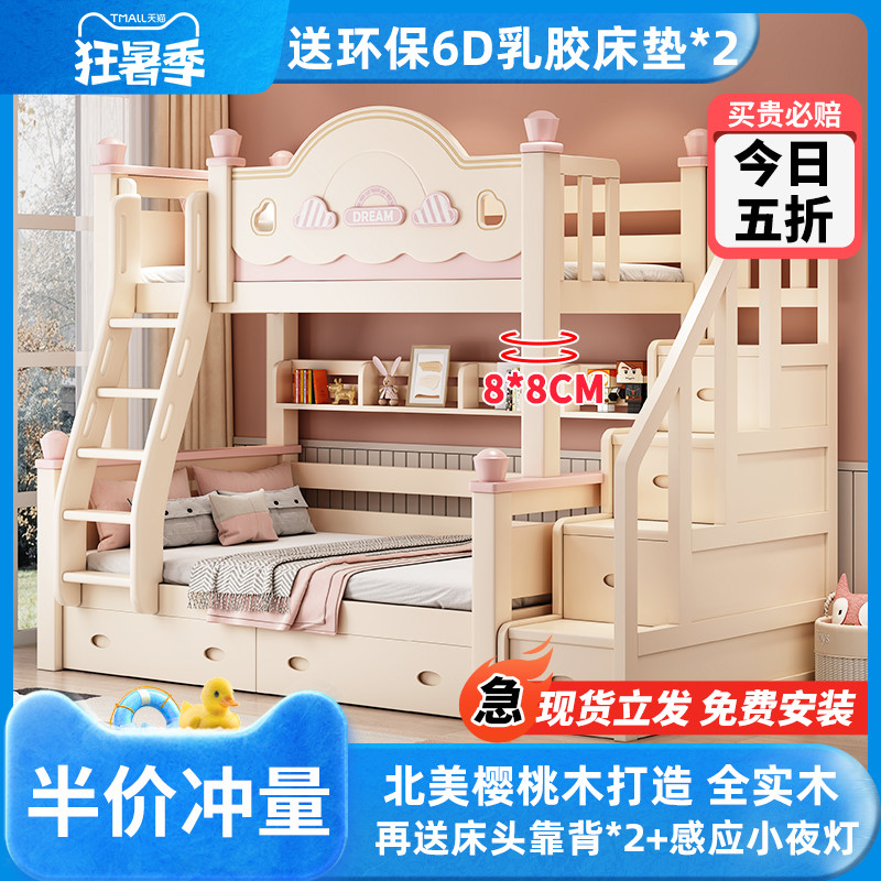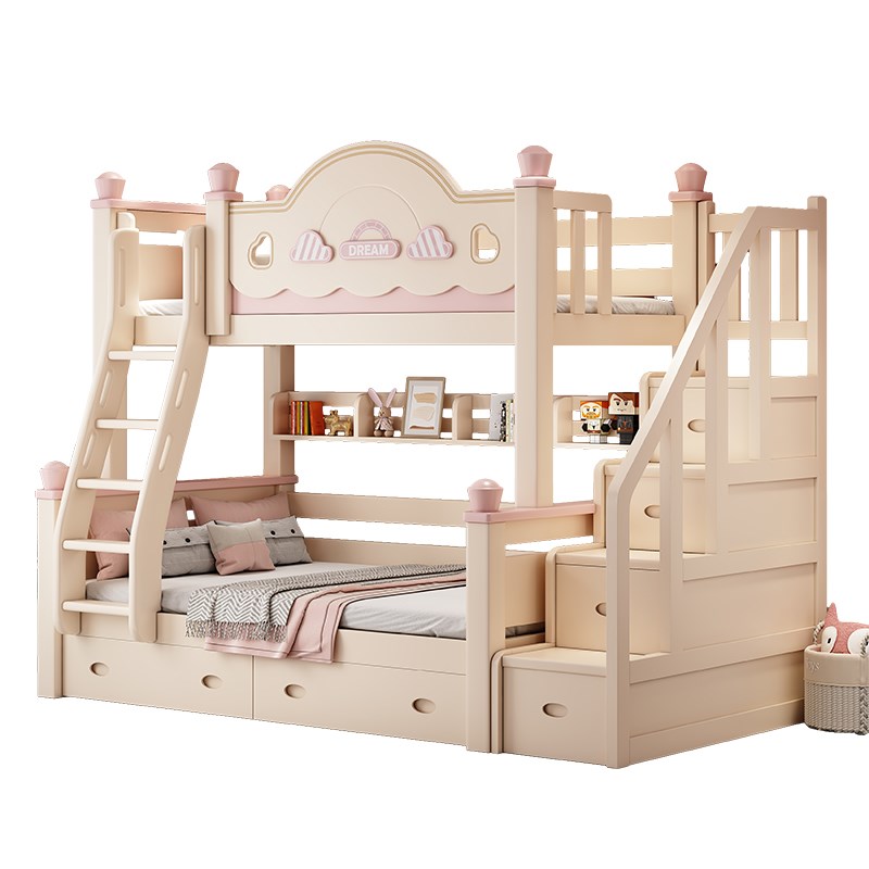 全实木上下床双层床女孩高v低床小户型粉色公主床儿童子母床上下