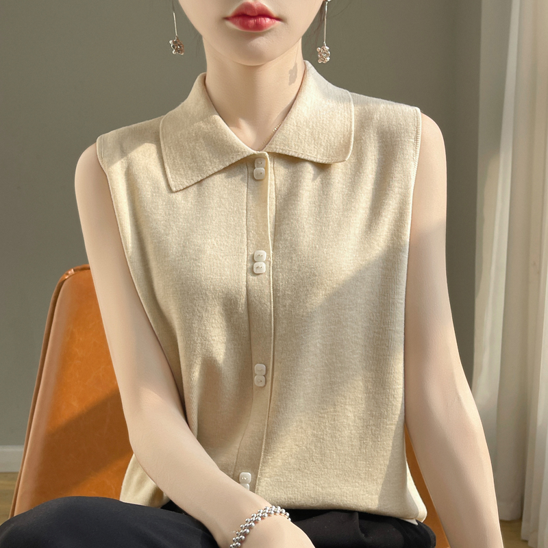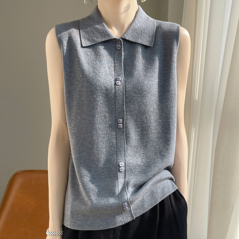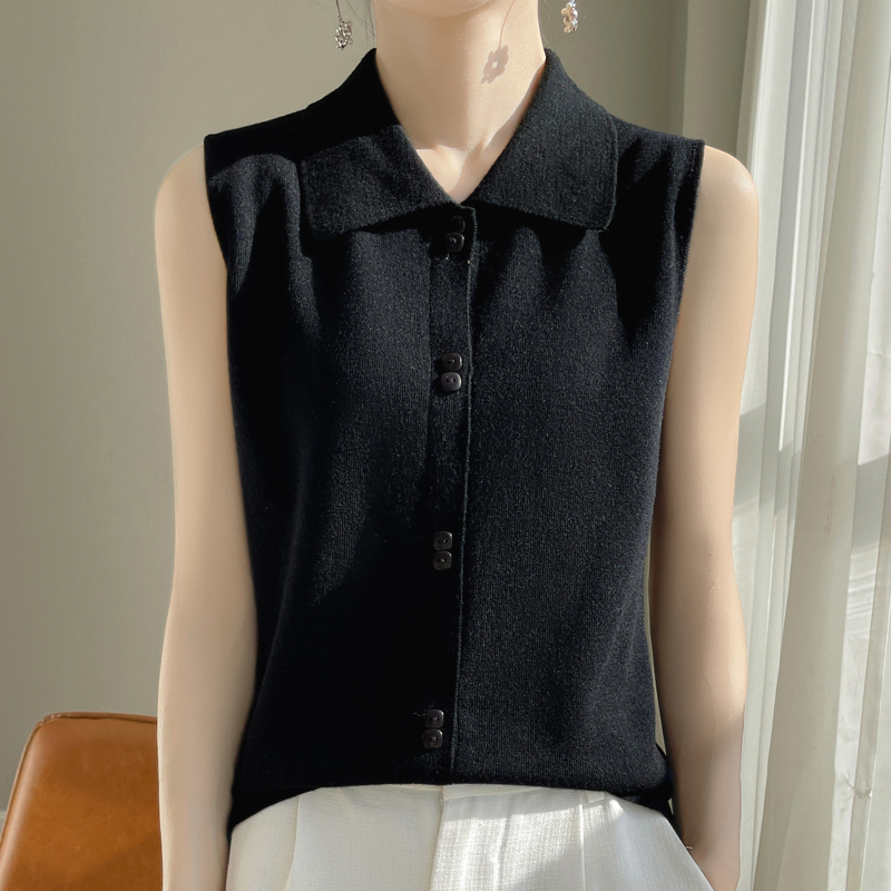 14针超细四平针织可机洗羊毛气质衬衫领无袖羊毛衫女早春内搭打底