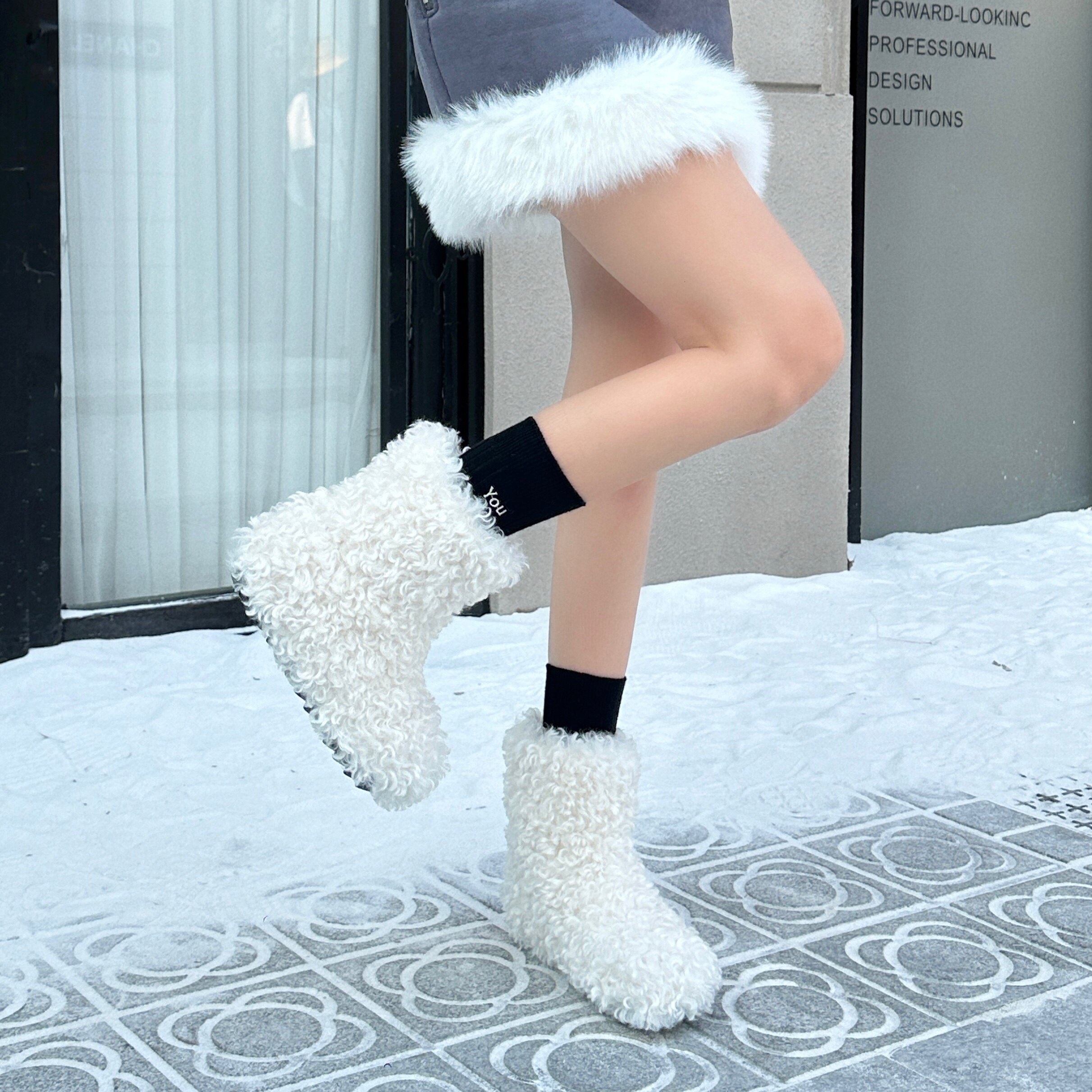 泰迪毛羊羔毛毛短靴内增高平底厚底雪地靴加绒加厚保暖短筒女棉鞋