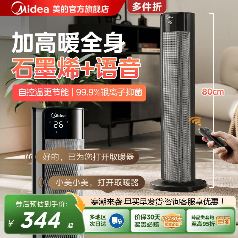 美的取暖器新款家用烤火炉石墨烯速热语音抑菌节能冬季神器暖风机