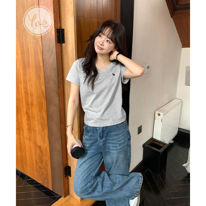 yoe灰色正肩打底v领短袖t恤女夏季新款纯棉内搭短款修身上衣女装