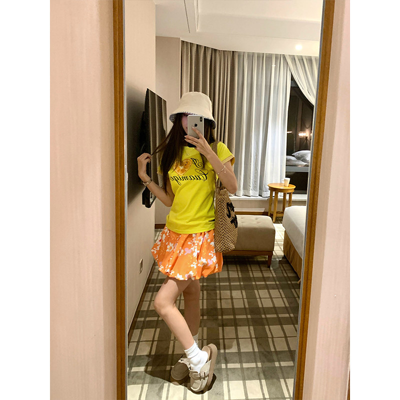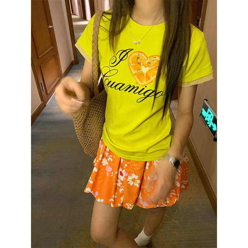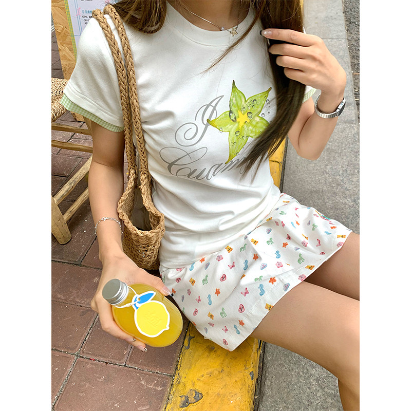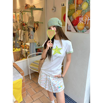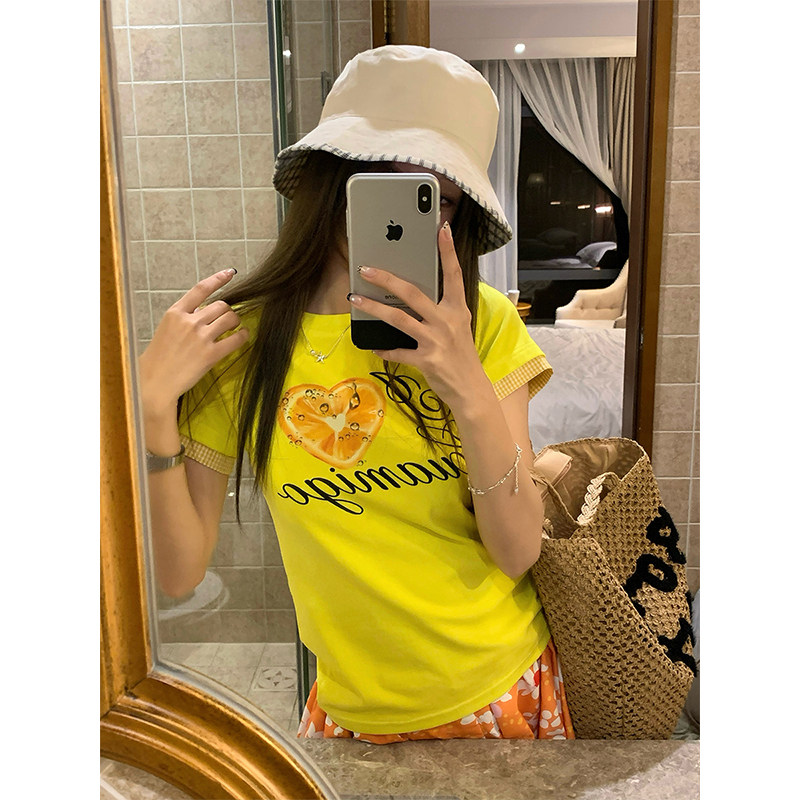 【现货】CCKOK杨桃印花拼格纹袖子正肩T恤夏季修身纯欲设计短袖女