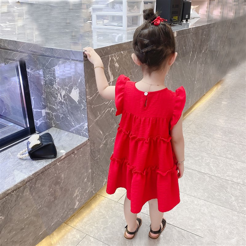 2021新款童装夏装3-8岁女童夏季雪纺大红色裙子女宝宝洋气连衣裙