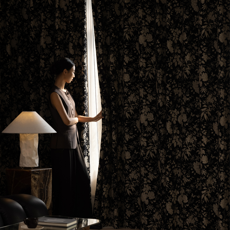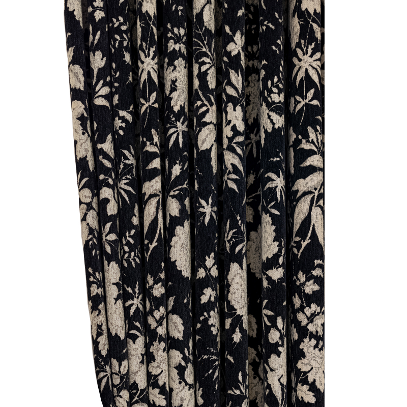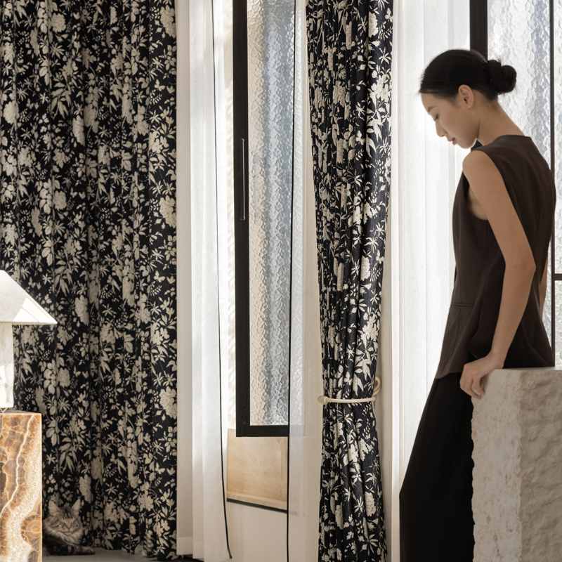 中式轻奢高窗帘遮光雪尼尔提花卧室防风隔音客厅水墨黑保暖飘窗布
