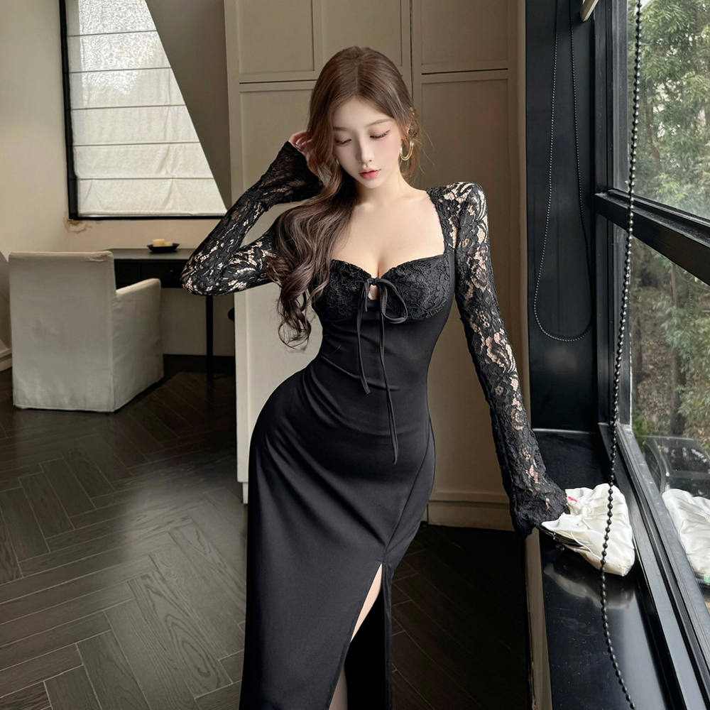 法式纯欲性感黑色蕾丝拼接长袖连衣裙女高级感超好看收腰开叉长裙