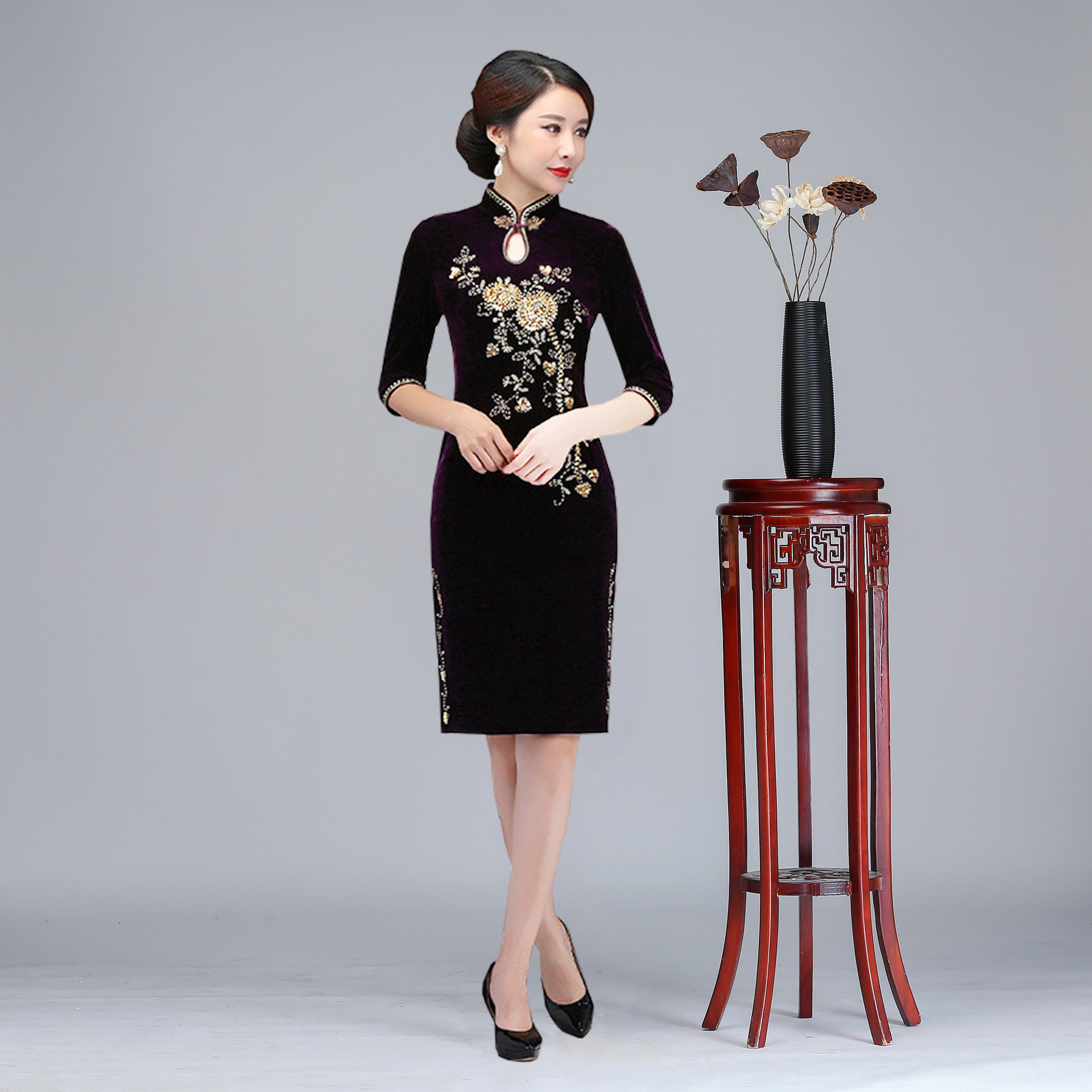 手工钉珠秋冬新款丝绒旗袍短款中袖复古敬酒妈妈装旗袍连衣裙改良