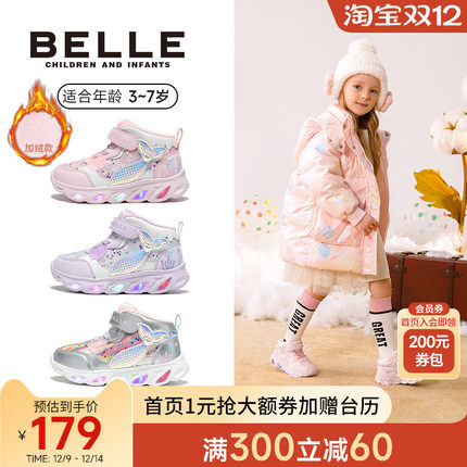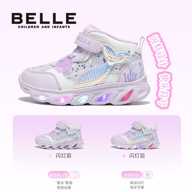 百丽童鞋25秋冬新款美人鱼闪灯鞋小女孩甜美加绒儿童运动鞋棉鞋