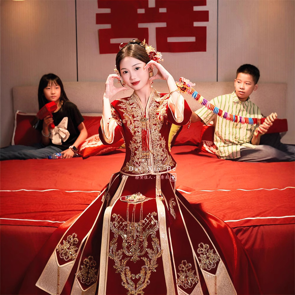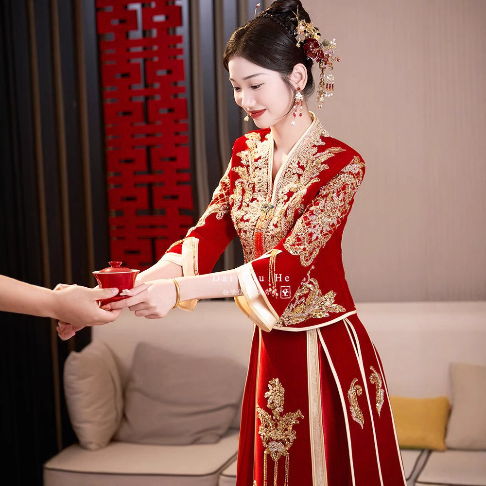 小个子丝绒V领秀禾服新娘 2025新款低领结婚礼服敬酒服中式嫁衣