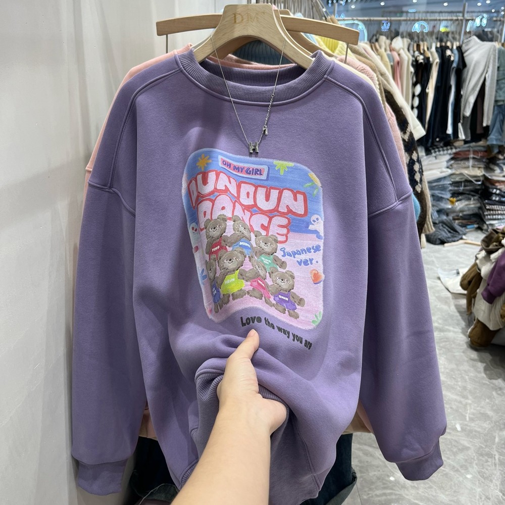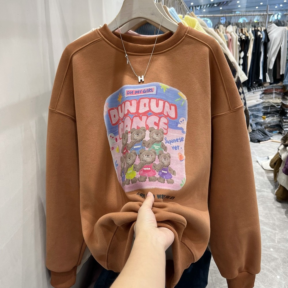 小熊加绒卫衣女2024新款韩版慵懒风宽松卡通加厚秋冬套头圆领上衣