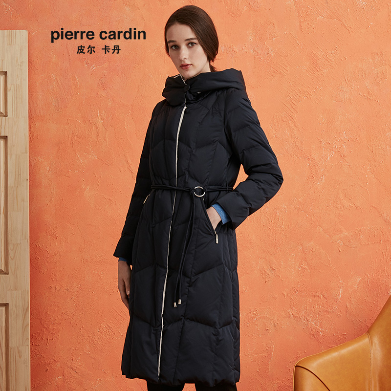 商场同款皮尔卡丹女装羽绒服长款修身连帽白鸭绒保暖羽绒外套