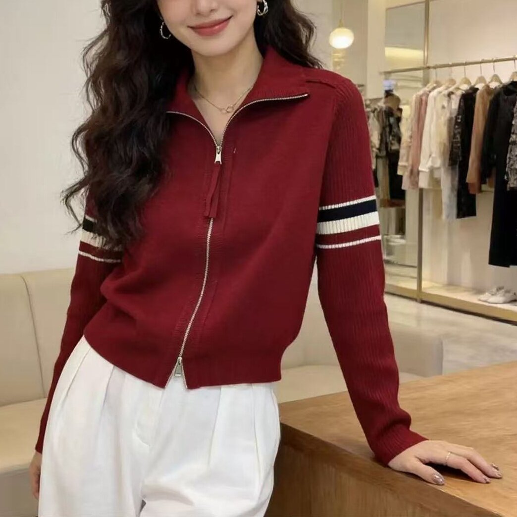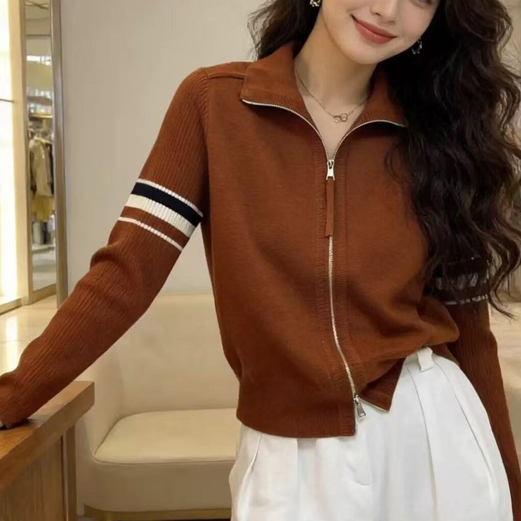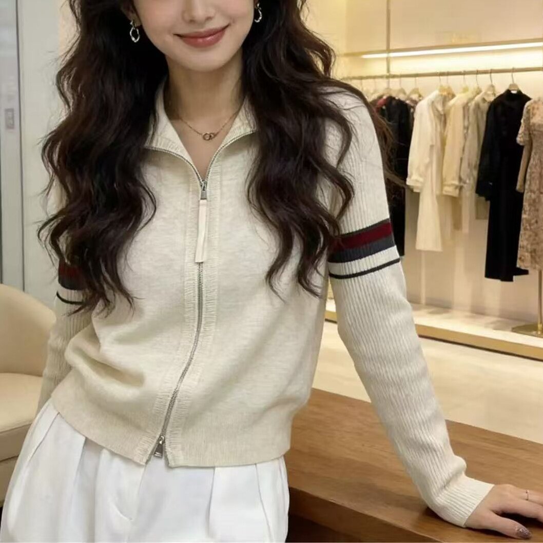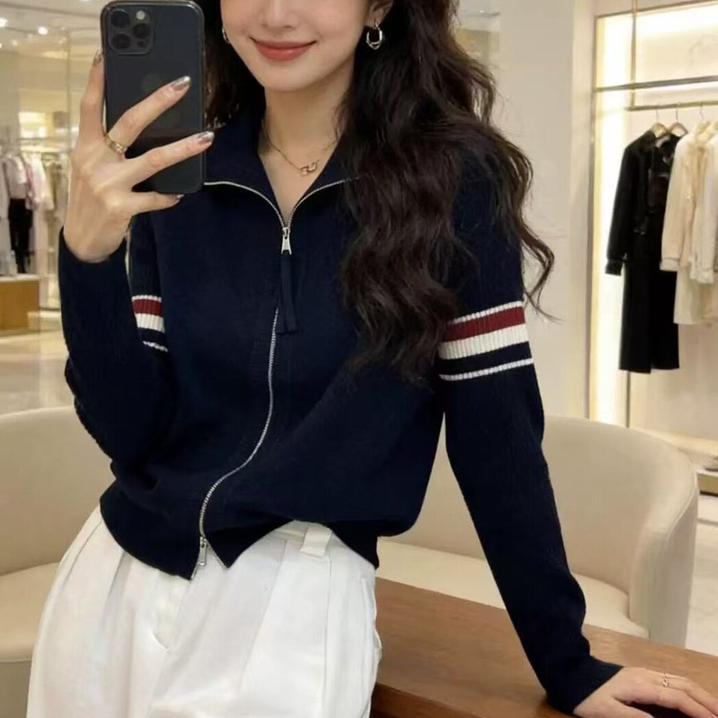 立领双拉链春季时尚翻领拼接撞色针织开衫女毛衣外套上衣软糯条纹