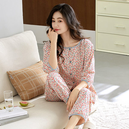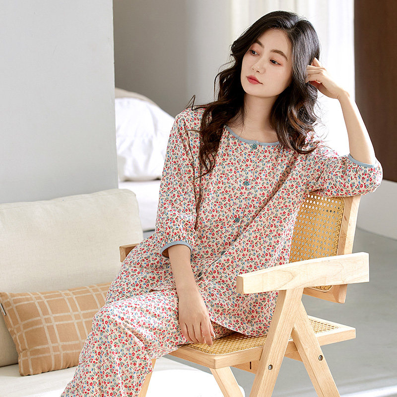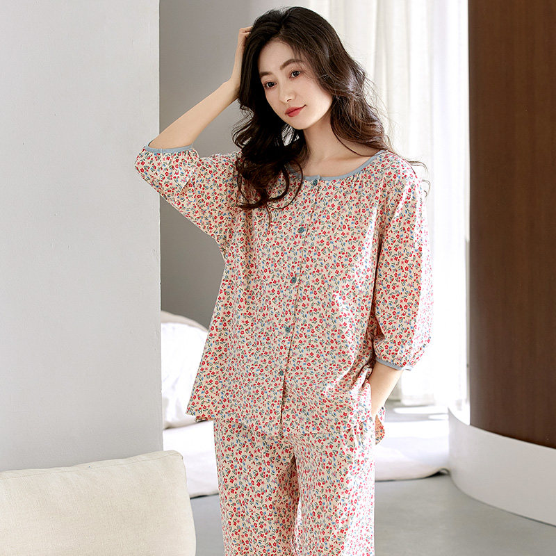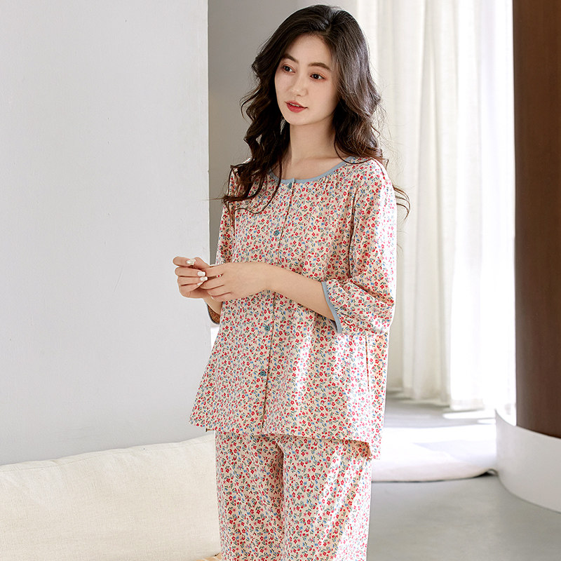 睡衣女夏季纯棉短袖七分袖中年妈妈碎花九分裤夏天全棉家居服套装
