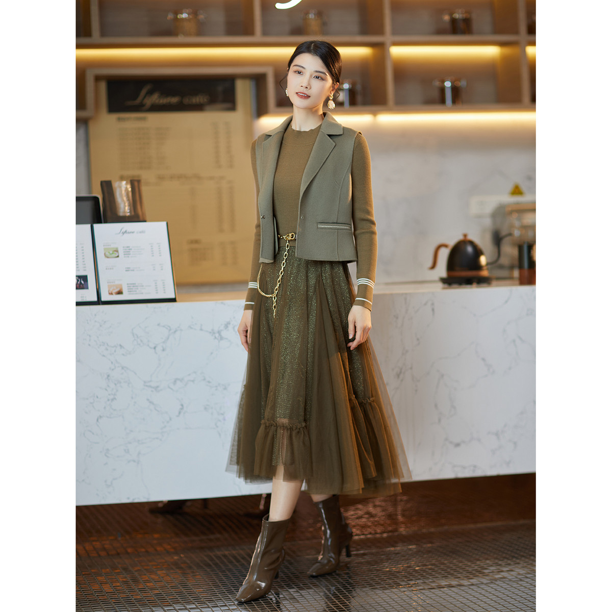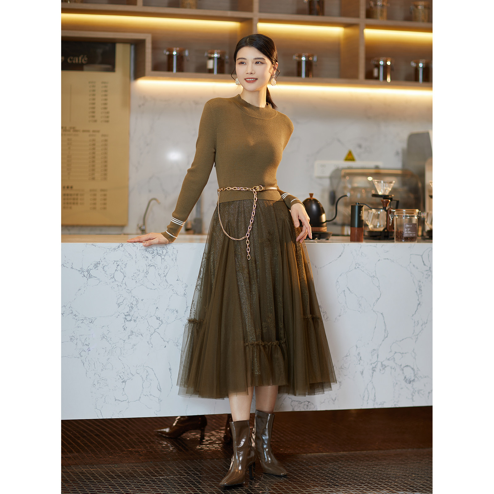 【商场同款】BBLLUUEE粉蓝衣橱2025冬装假两件拼接纱裙修身连衣裙