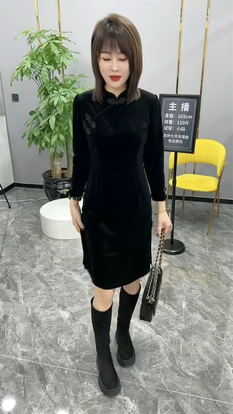 气质网红金丝绒连衣裙女234春季新款立领设计感中国风复古旗袍潮