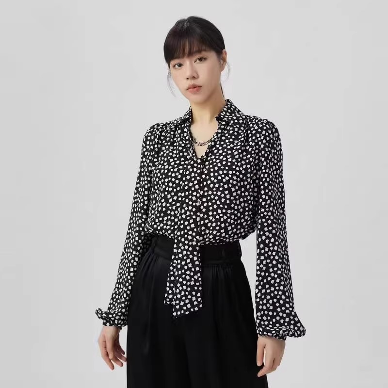 气质飘带桑蚕丝V领衬衫长袖上衣