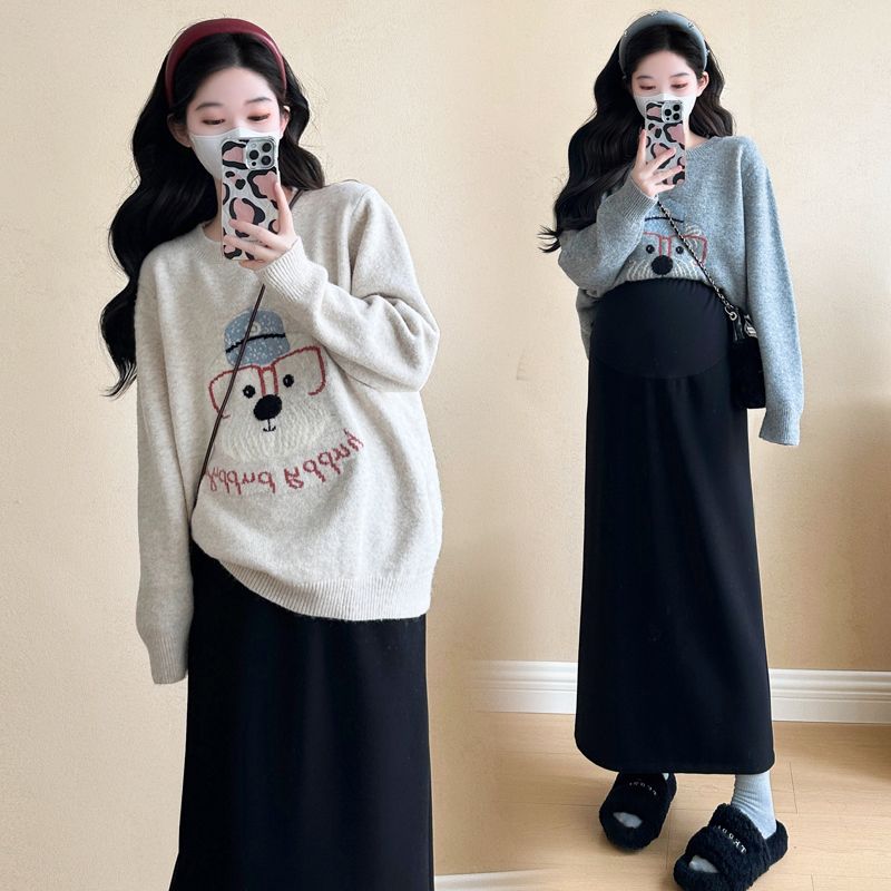 孕妇套装秋装2025新款宽松圆领长袖针织毛衣直筒半身裙秋季两件套