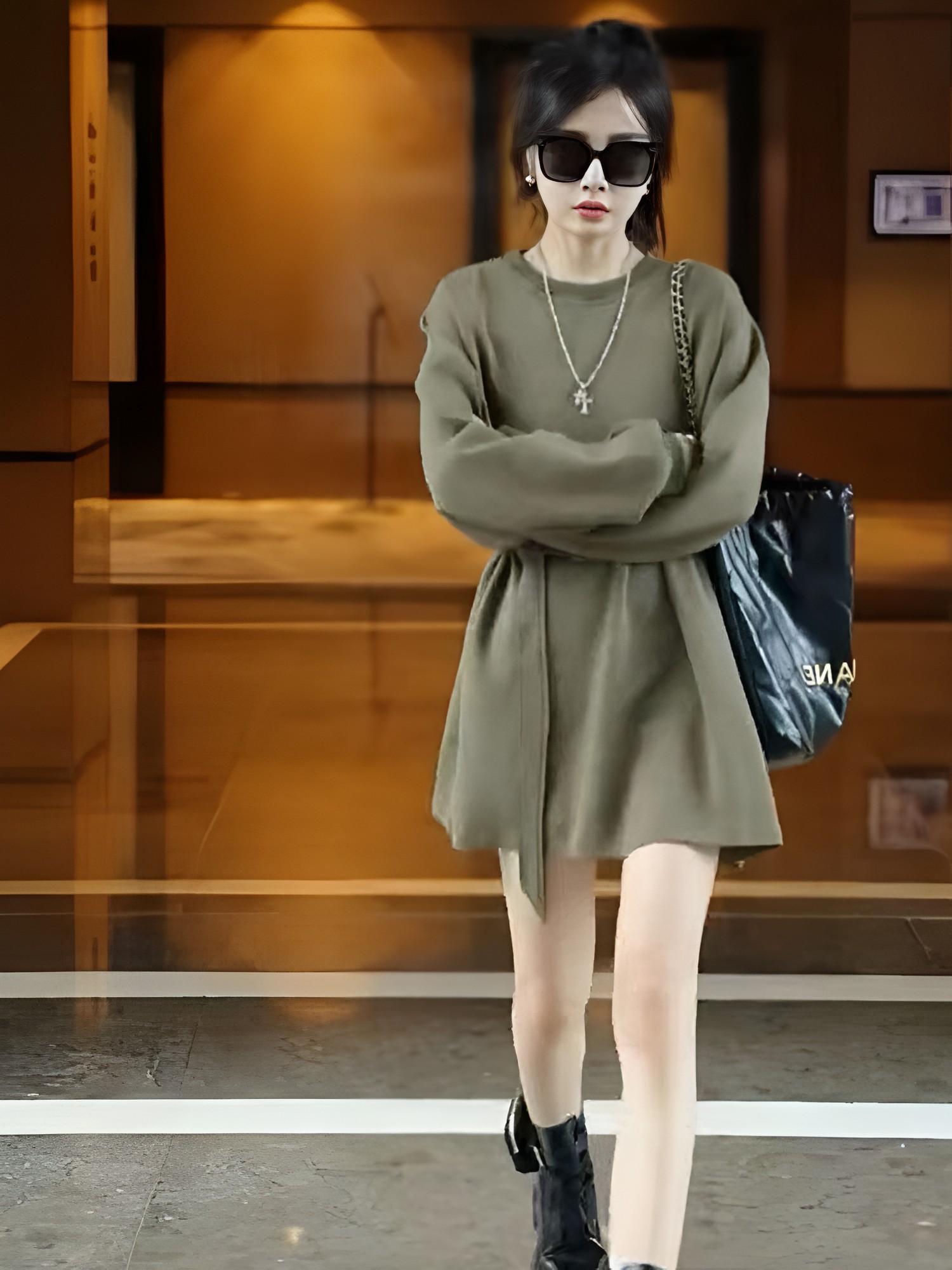 新款早秋军绿色气质两穿长袖卫衣女宽松中长款系带设计感收腰显瘦