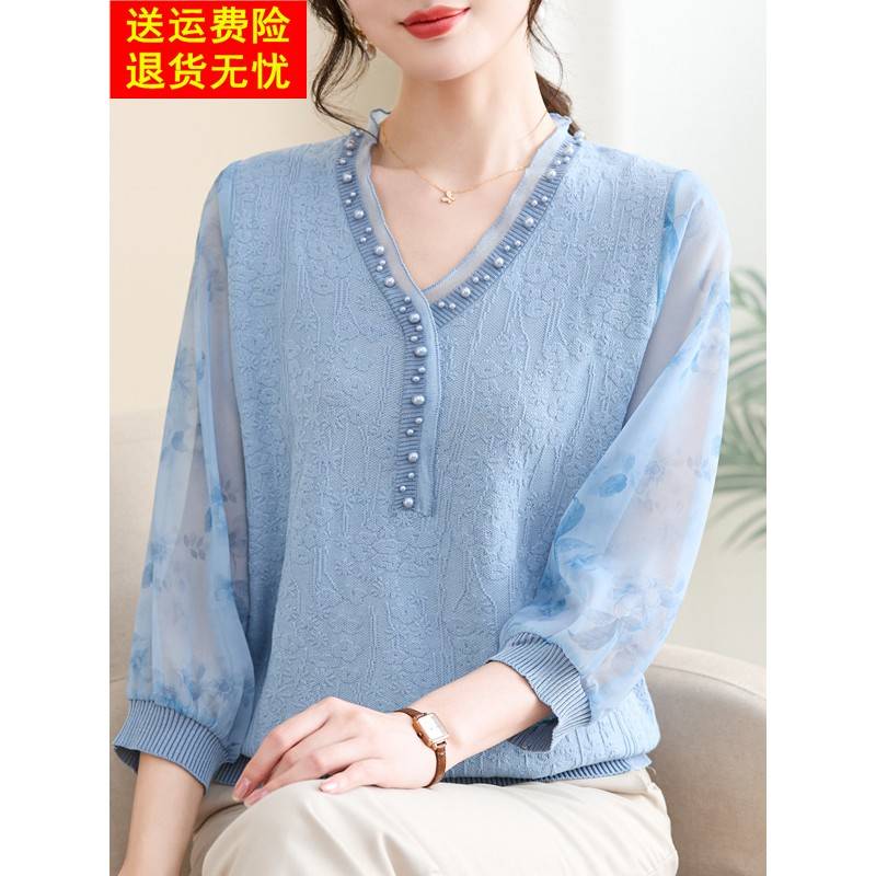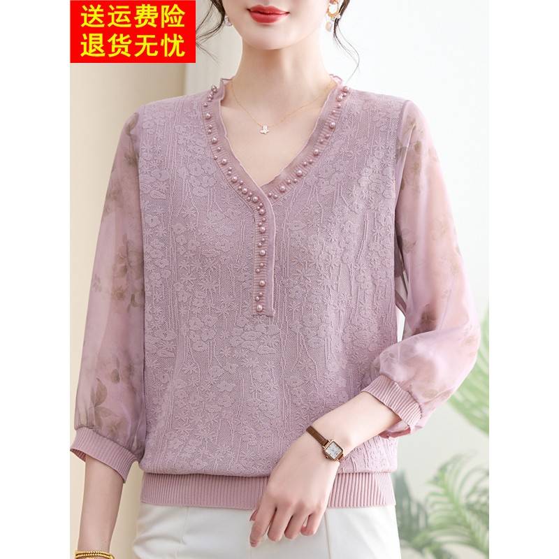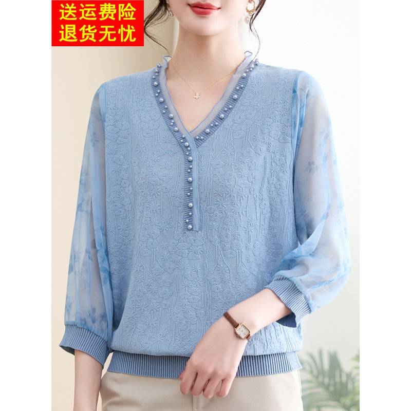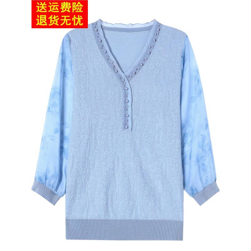 妈妈冰丝T恤洋气高贵加肥加大码女装钉珠V领上衣中老年纱袖针织衫