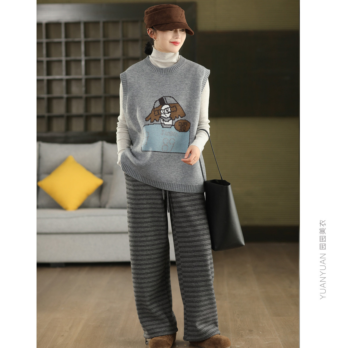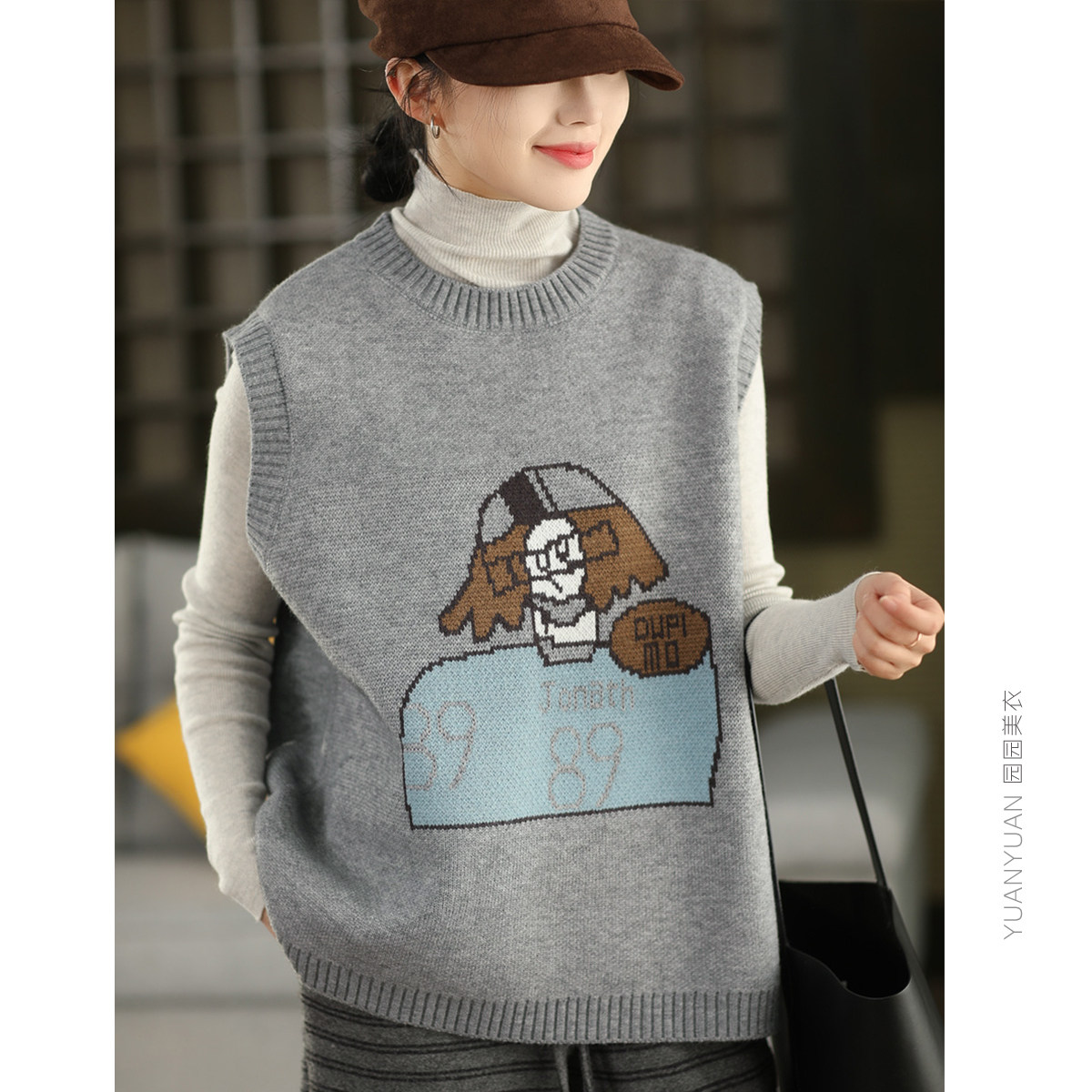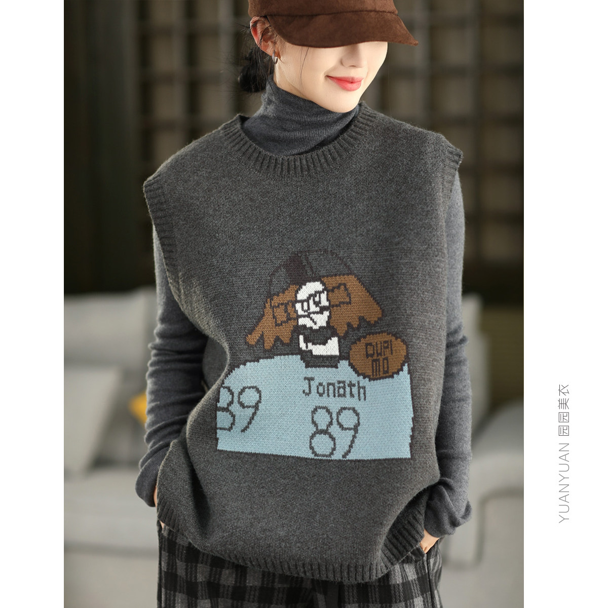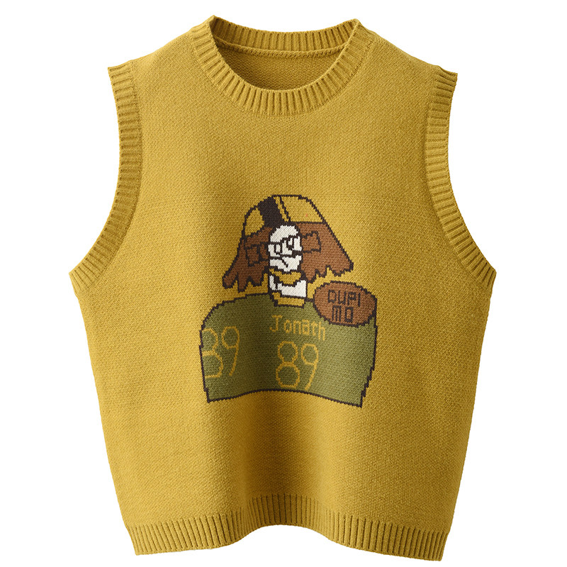 园园美衣冬季复古提花卡通加厚马女保暖圆领无袖套头上衣马夹背心