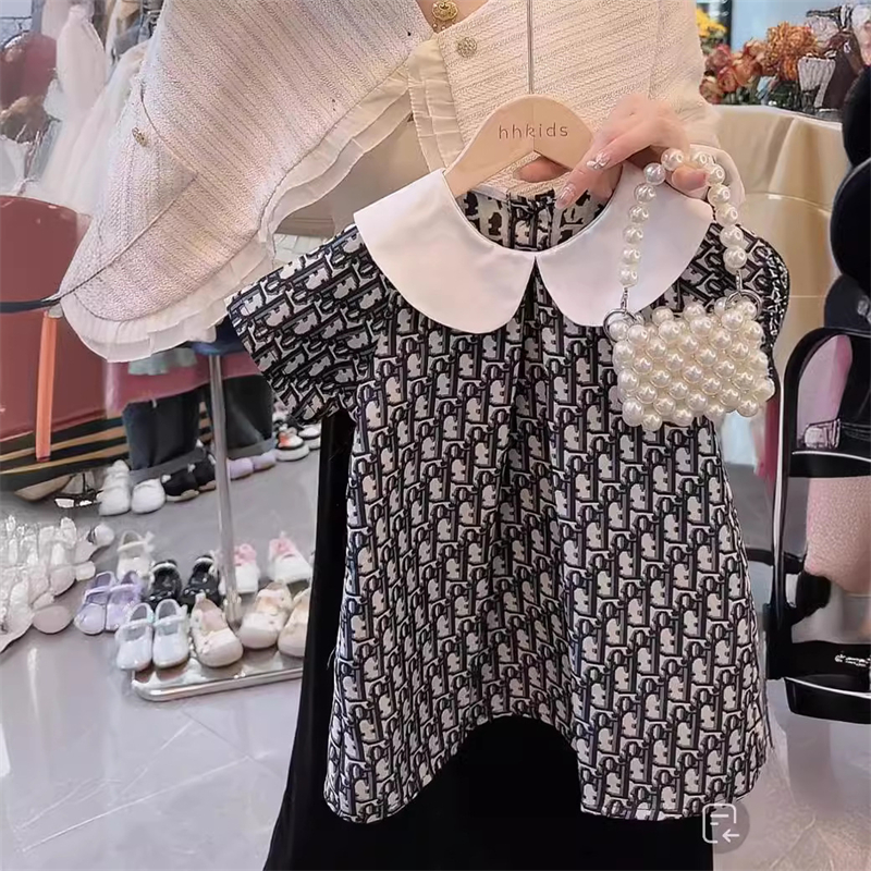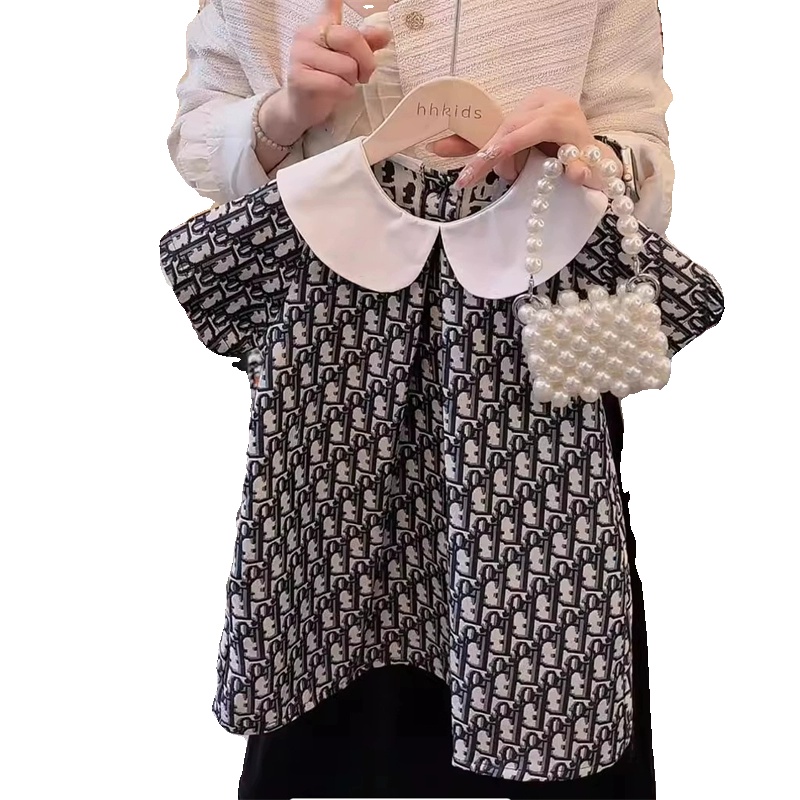 女童连衣裙韩版洋气学院风娃娃领短袖连衣裙印花2025夏季新款裙子
