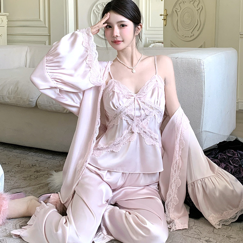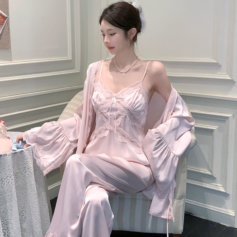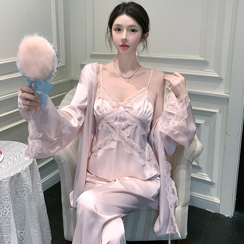 春夏季睡衣女带胸垫冰丝性感吊带蕾丝法式睡袍三件套装丝绸家居服