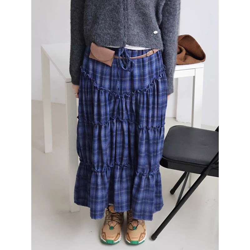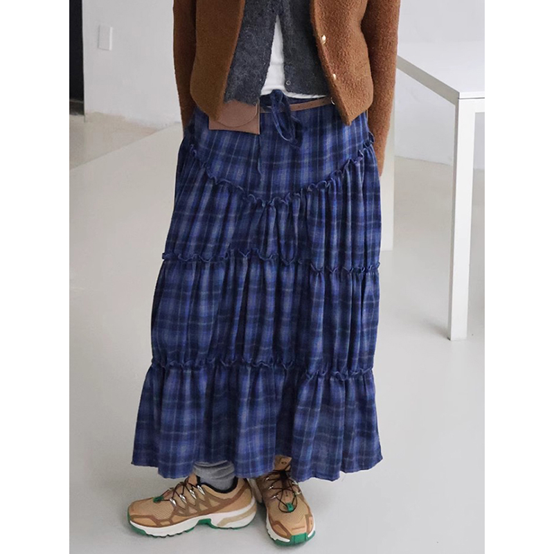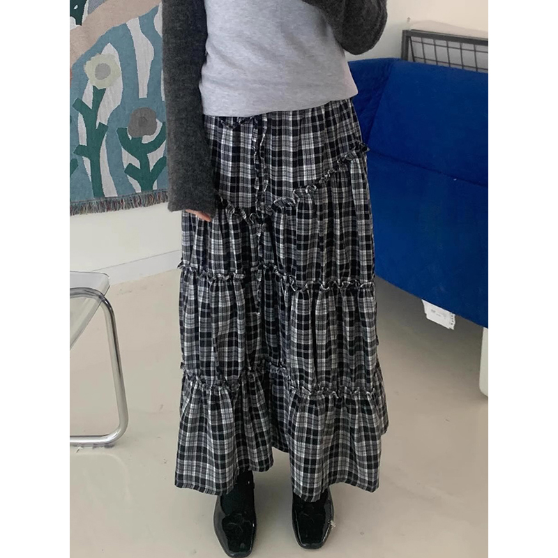 良良家复古拼接木耳边格子半身裙女春季新款小众褶皱荷叶边长裙子