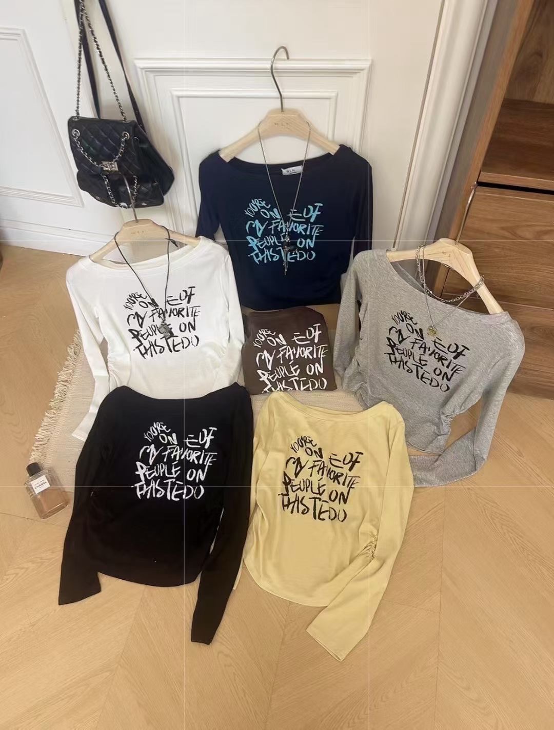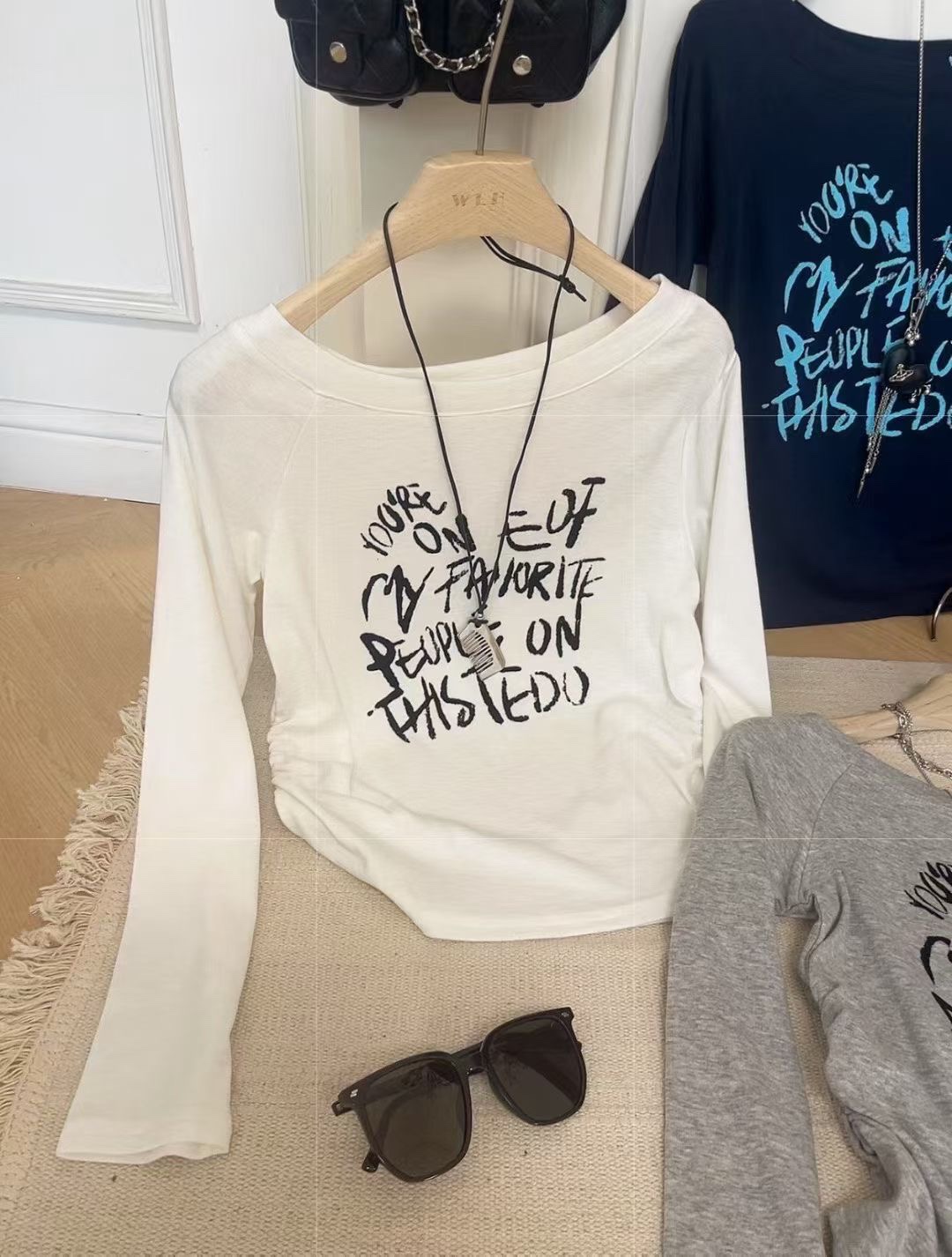 2025秋季新款时尚设计感一字肩修身显瘦百搭字母印花长袖上衣女潮
