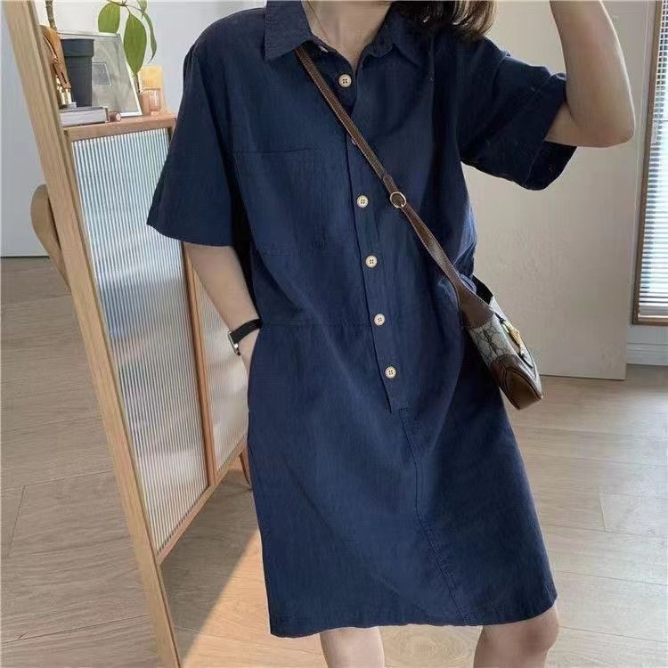 夏季薄款短袖棉麻连衣裙女宽松气质翻领简约小个子中长衬衫裙直筒