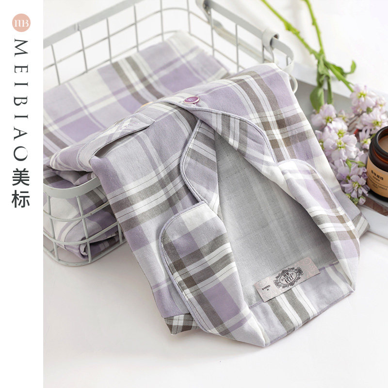 美标新款长袖双层棉纱纯棉睡衣套装女春秋季全棉休闲格子家居服冬