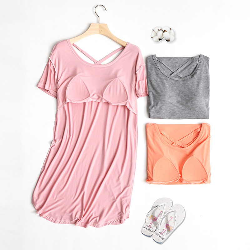 带胸垫睡裙女夏季性感露背裙美背短袖中裙莫代尔睡衣女薄款家居服
