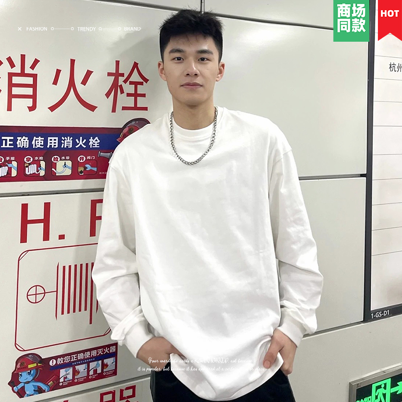 美式重磅潮牌男装长袖T恤男纯棉纯色上衣情侣白色宽松内搭打底衫