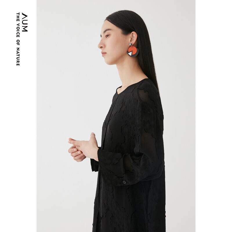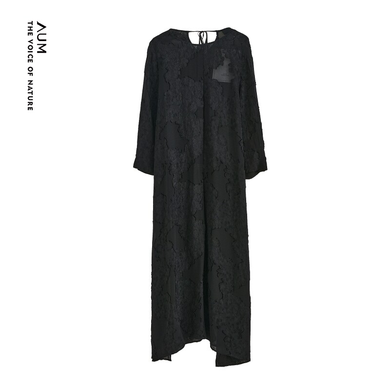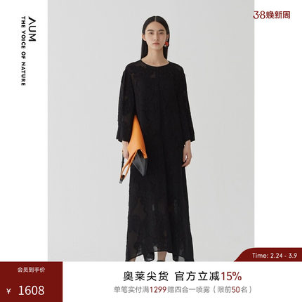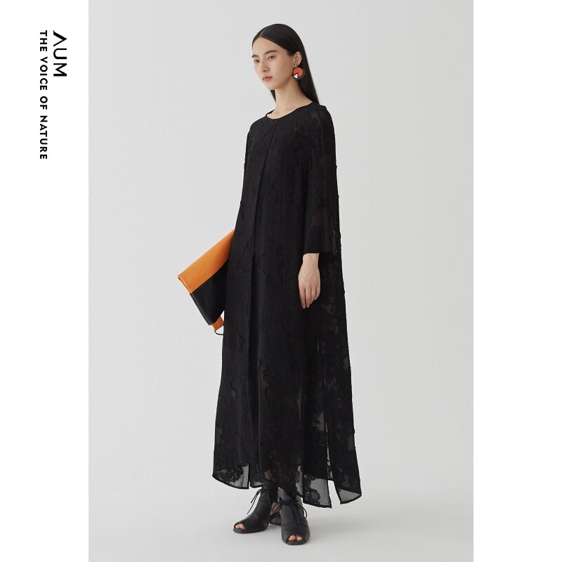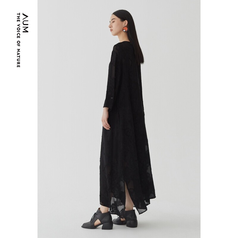 AUM噢姆秋季气质长袖黑色提花中长连衣裙