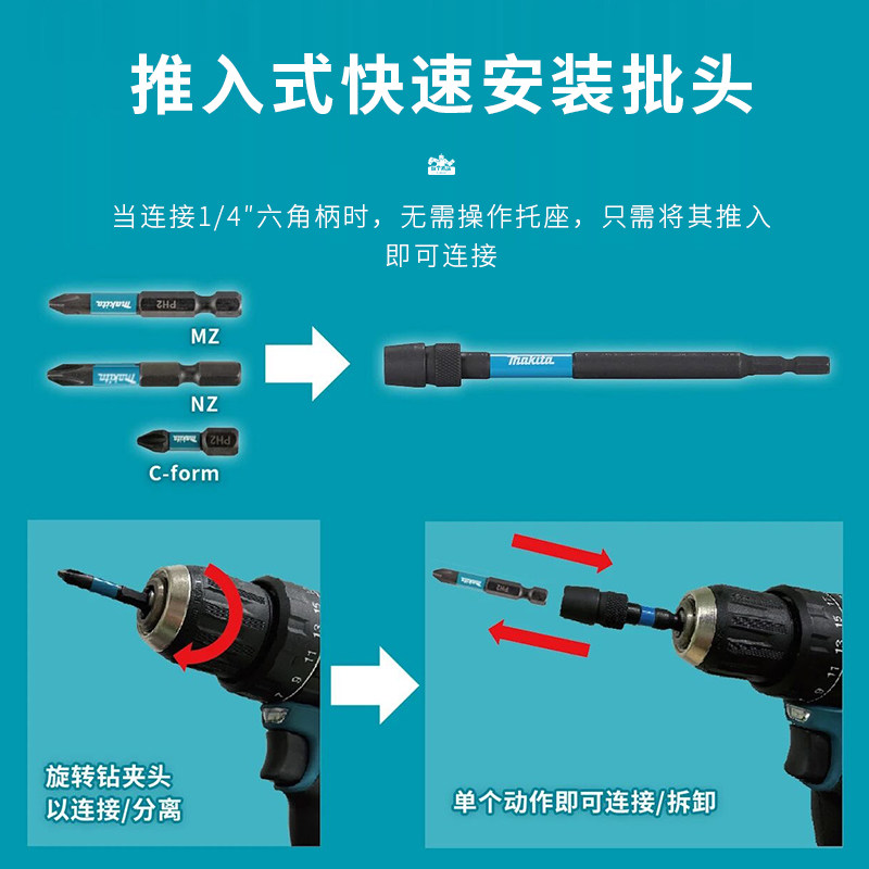 Makita牧田原装加长批头快换接杆电钻起子机六角柄多功能延长杆