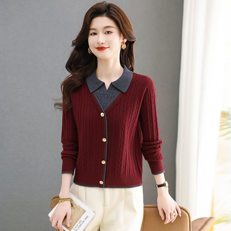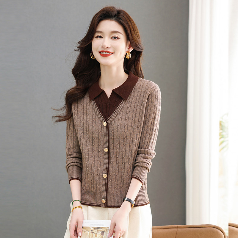 2025早秋新款翻领羊毛假两件毛衣女时尚气质宽松洋气针织打底衫