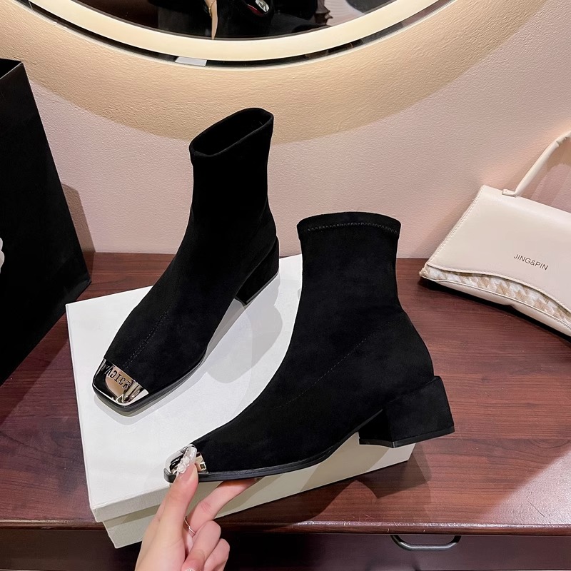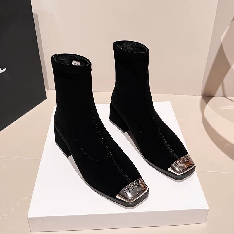 气质短靴女法式方头2024新款秋季靴子粗跟高跟女士瘦瘦靴女款单靴