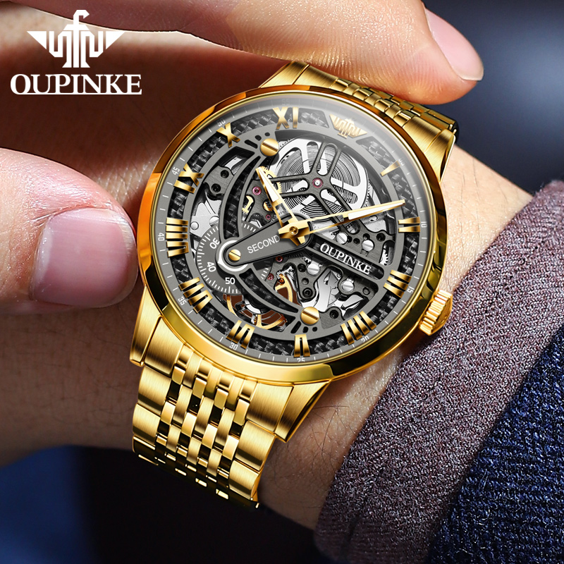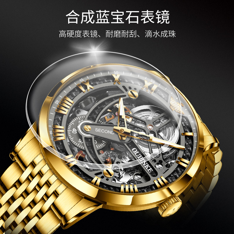 瑞士欧品客官方正品牌手表男士自动机械表镂空真皮带时尚防水十大