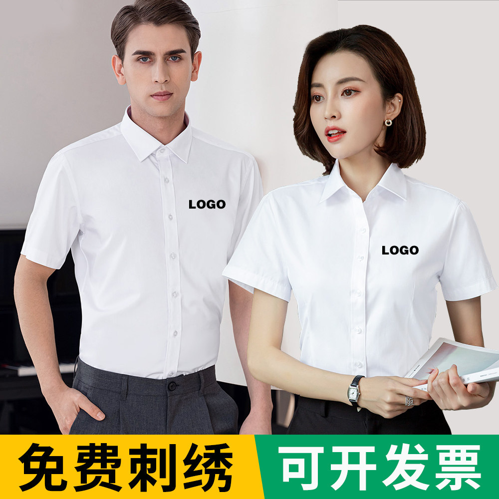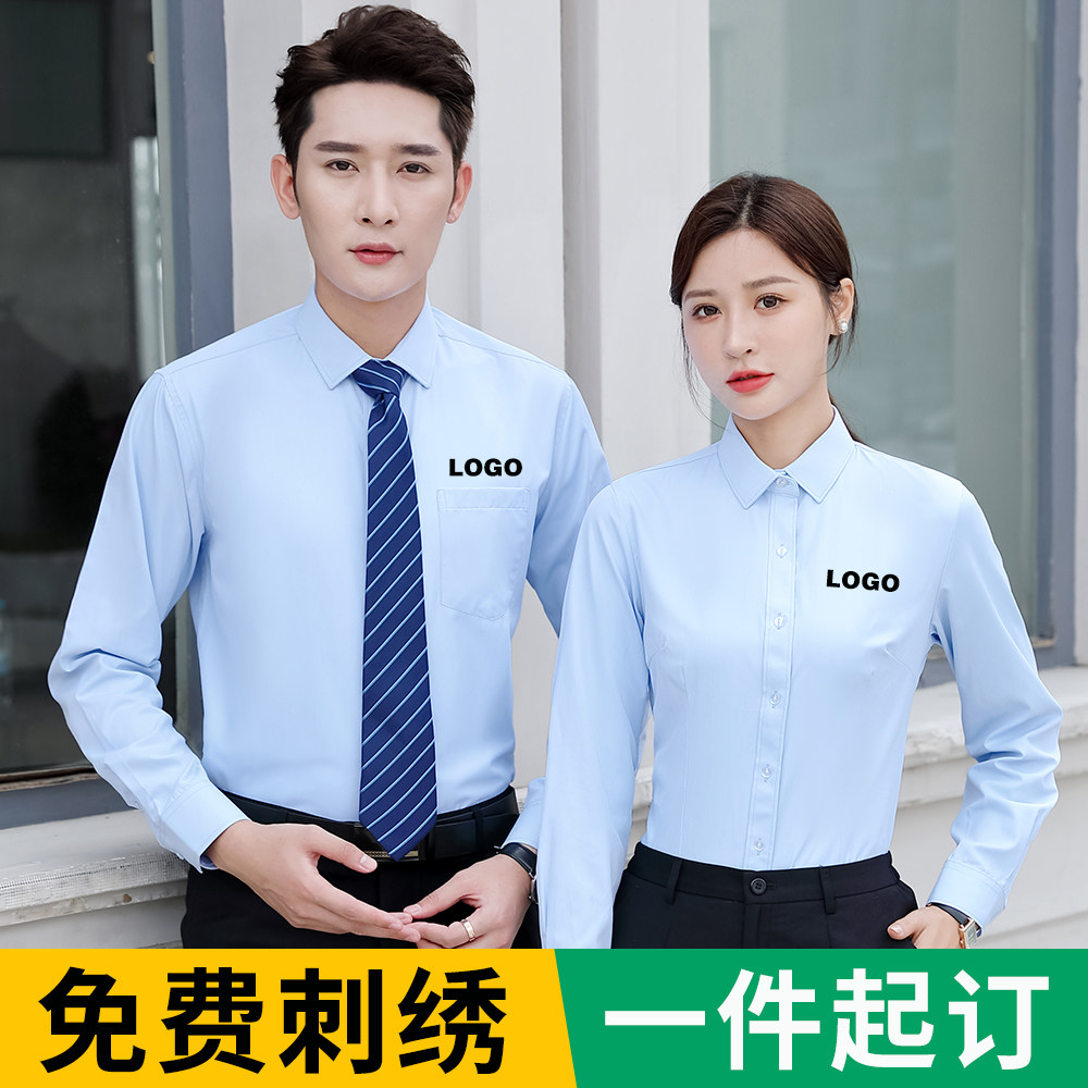 定制长袖白衬衫绣LOGO男女工作服职业工装商务公司短袖蓝衬衣印字