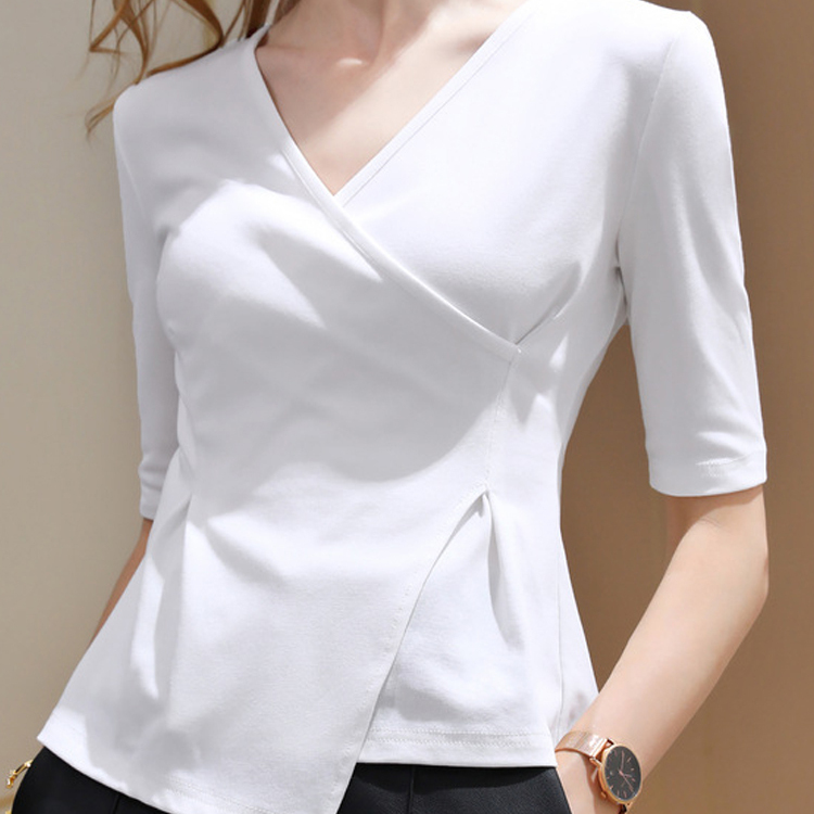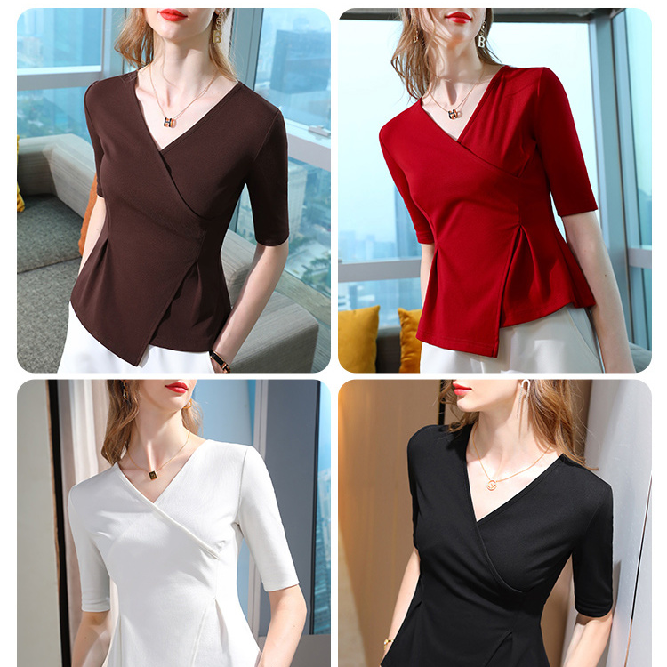 法式不规则中袖棉t恤女春显瘦v领打底衫不对称洋气收腰交叉上衣