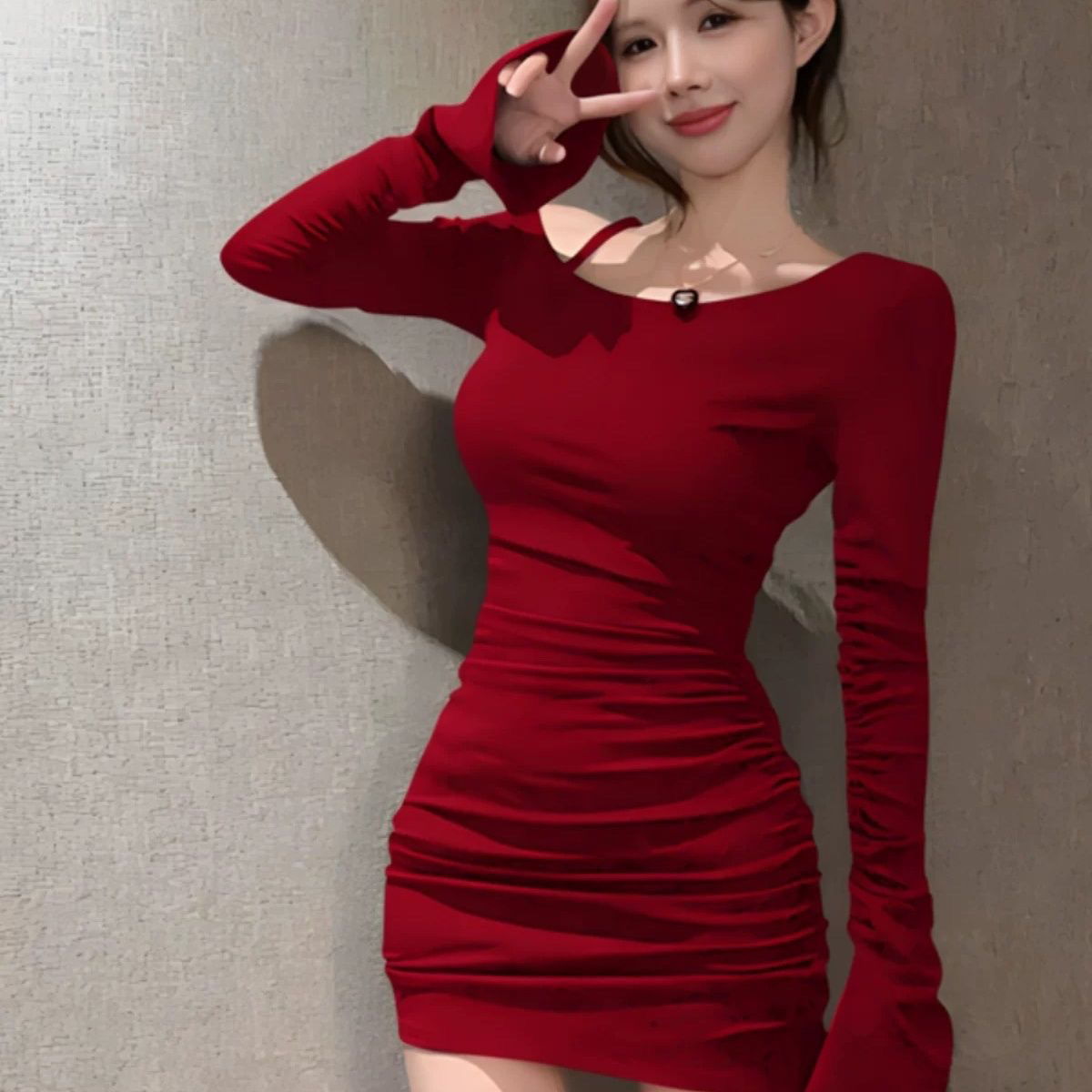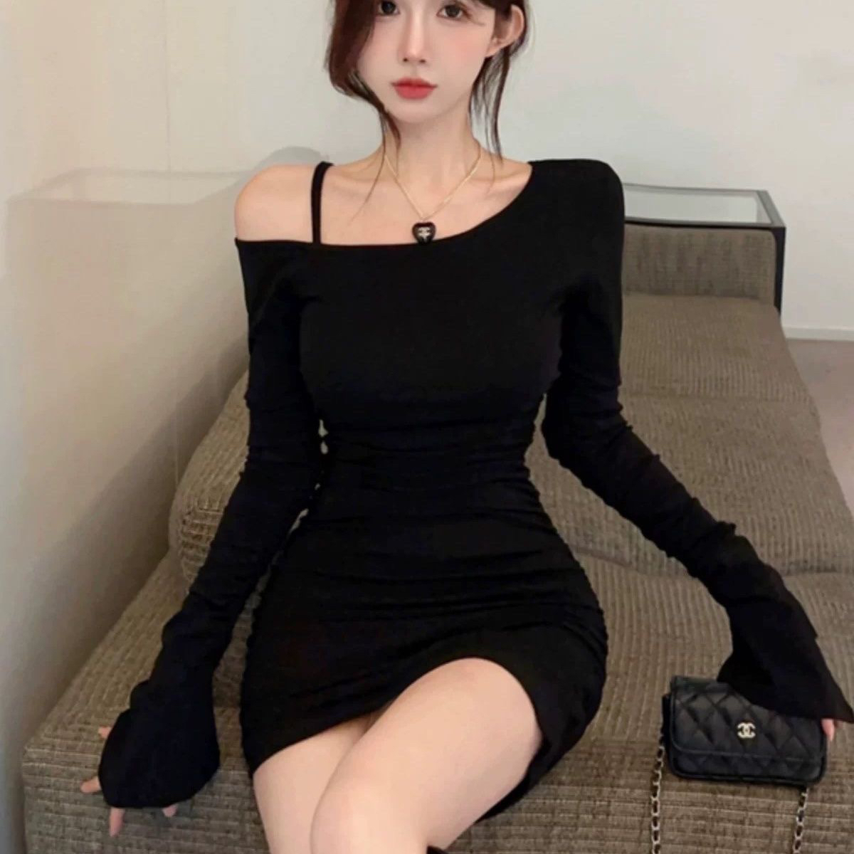 辣妹性感超好看显身材黑色露肩连衣裙女一字肩紧身包臀绝美短裙子