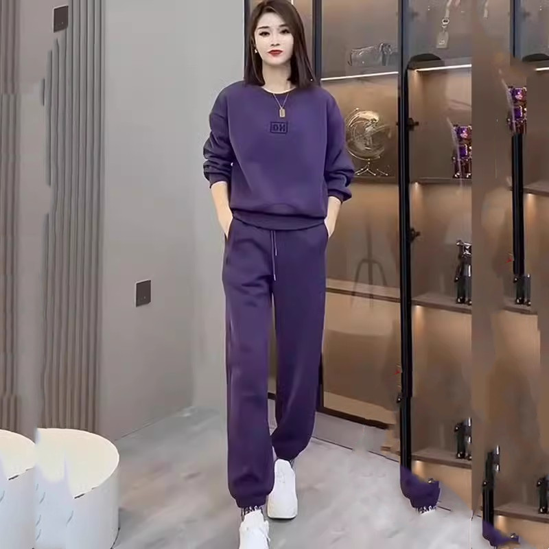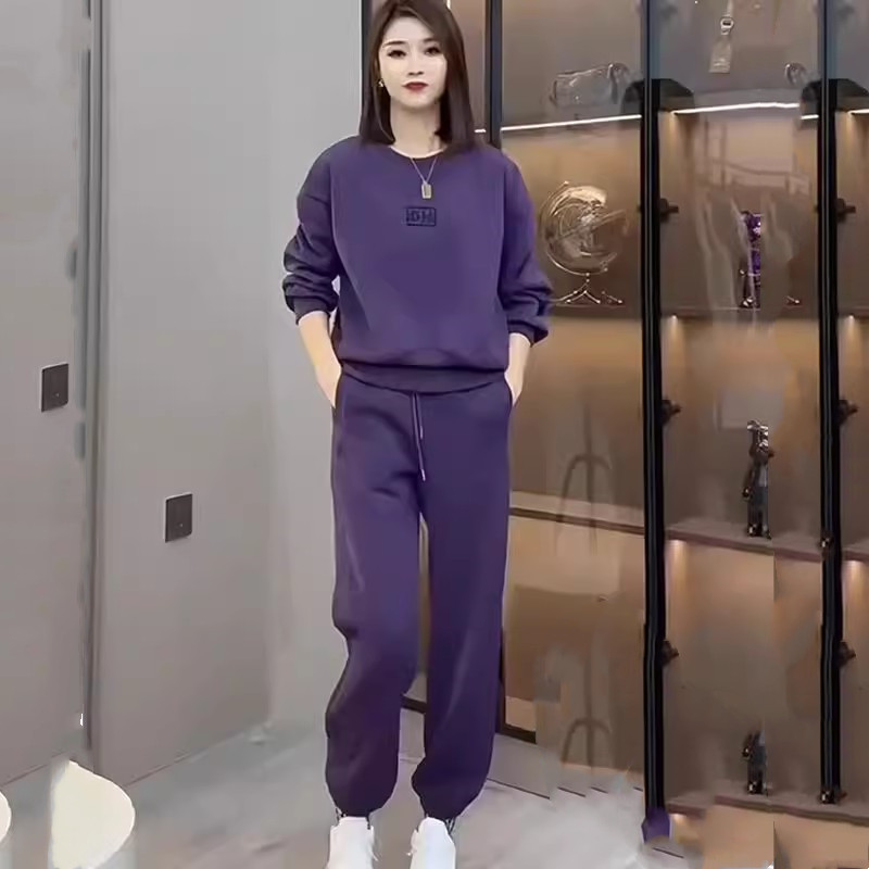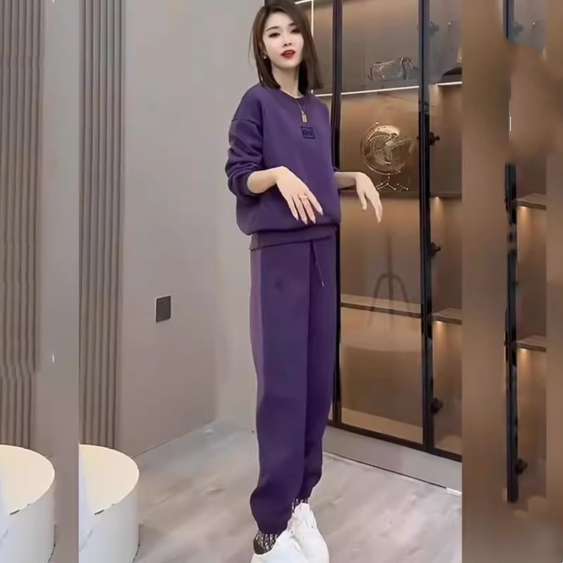 紫色加绒运动套装女秋冬2025新款时尚圆领卫衣束脚裤休闲两件套潮