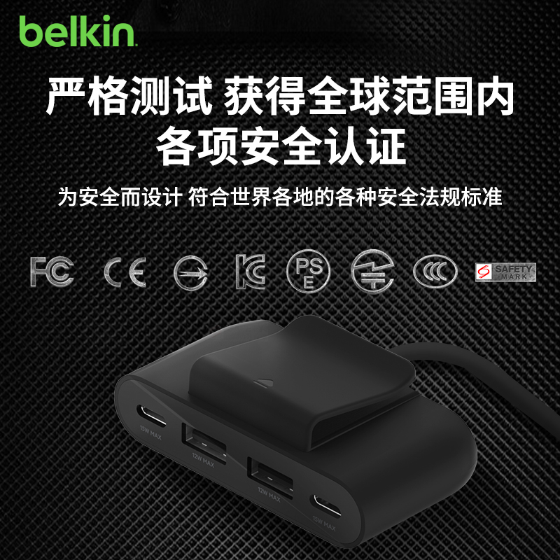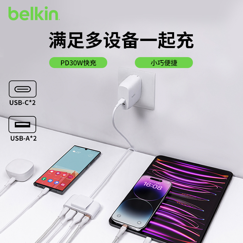 Belkin贝尔金4口USB电源扩展器小巧便捷USB-A/USB-C一拖四扩展30w旅行家用快速充电排插2米接线板
