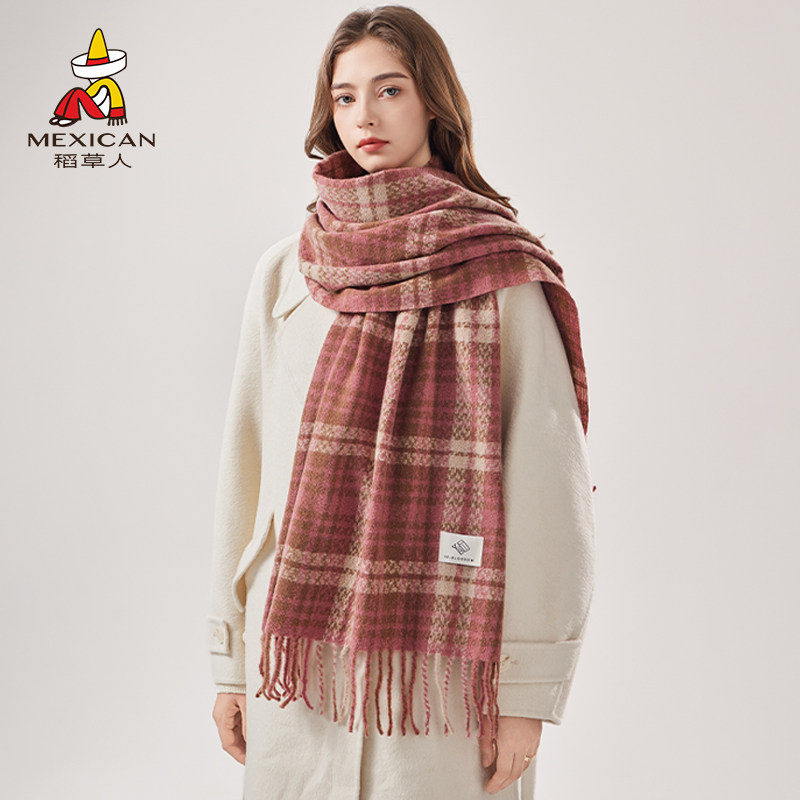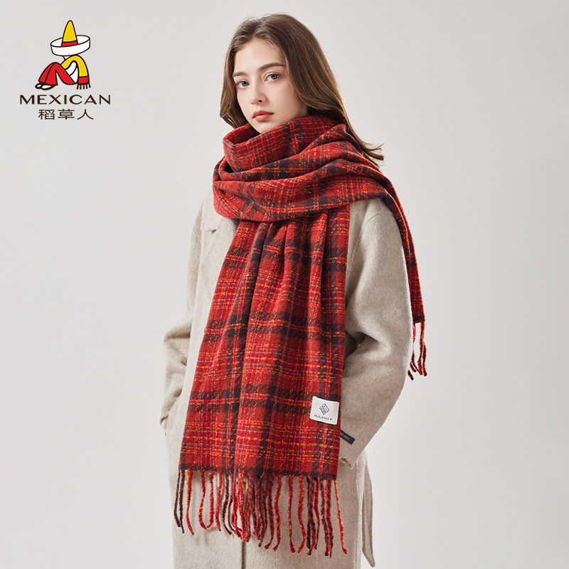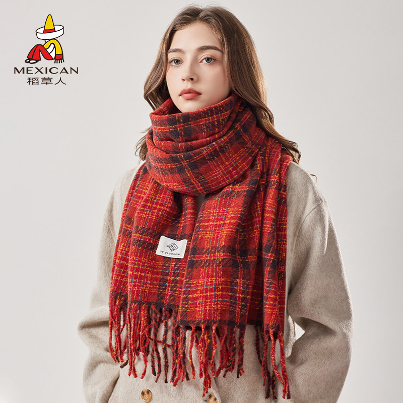 稻草人韩系围巾女冬新款圣诞氛围感加厚保暖红色格子围脖新年礼物
