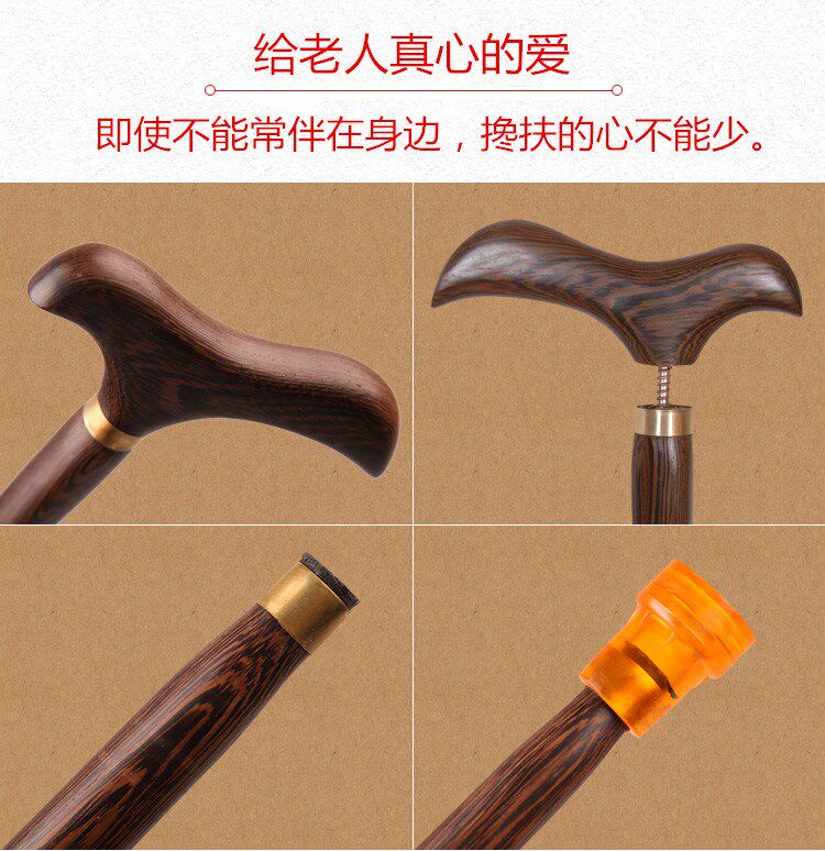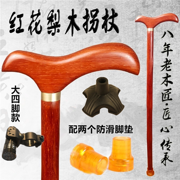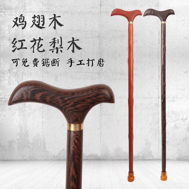 鸡翅木拐杖实木轻便防滑手杖原木色户外徒步登山杖带灯四脚拐棍