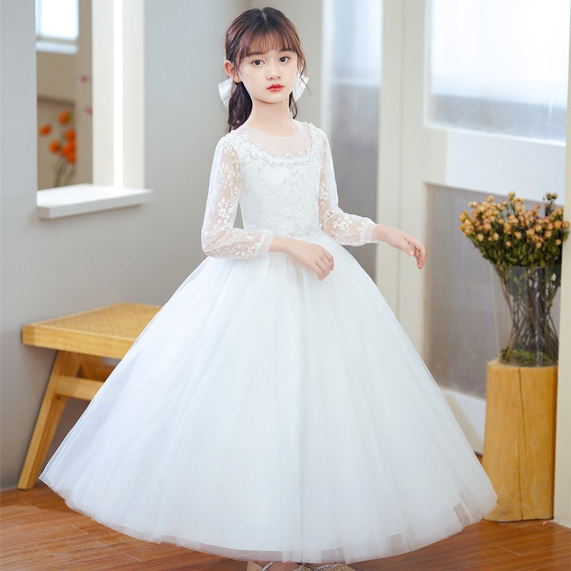 儿童婚纱裙白色礼服连衣裙女童长袖粉红色公主长裙春秋花童演出服