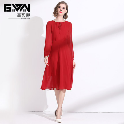 红色连衣裙2025新款春长袖收腰显瘦纯色气质雪纺裙女春秋中长款